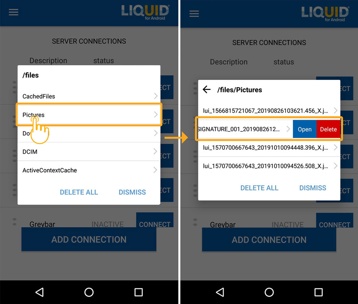 - To view all the pictures present in the folder of our App, tap on the Pictures option. You can either swipe left to open or delete the pictures using the Open and Delete option, or you can navigate back using the back arrow button.