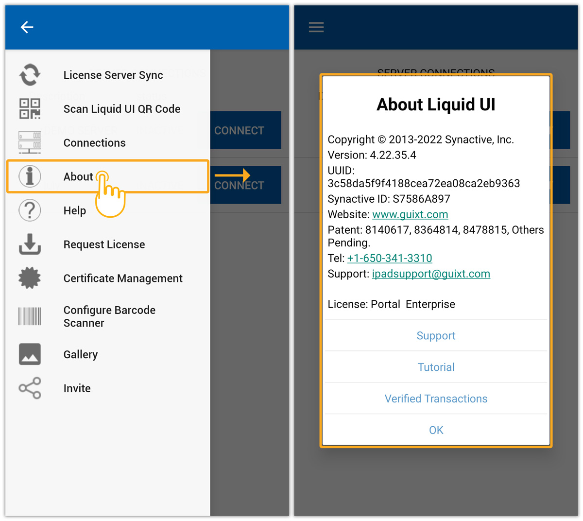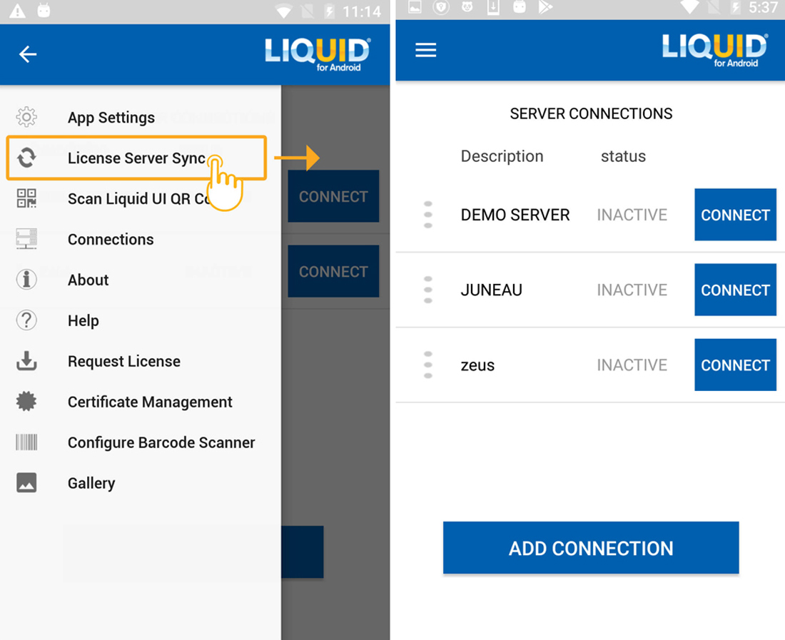 The License Server Sync option is present under Main Menu, just below the App Settings option. This option can restore the InApp license (bought from Google Playstore). Additionally, for a LAMP license, SAP Server connection detail will also be updated. To get more information on the process to renew your license, you can check the License pack renewal process.