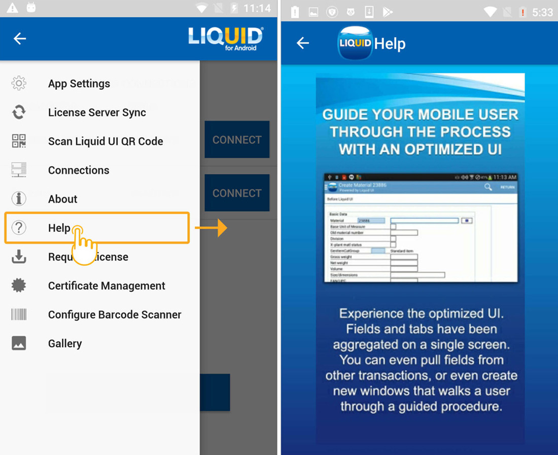 The Help option displays a series of user guide screens, which pilot the user through the configuration of Liquid UI. It provides information related to getting started with the DEMO server, then further connecting to your SAP server and using the functionalities provided by Liquid UI. This screen appears when you open the Help option on your device.