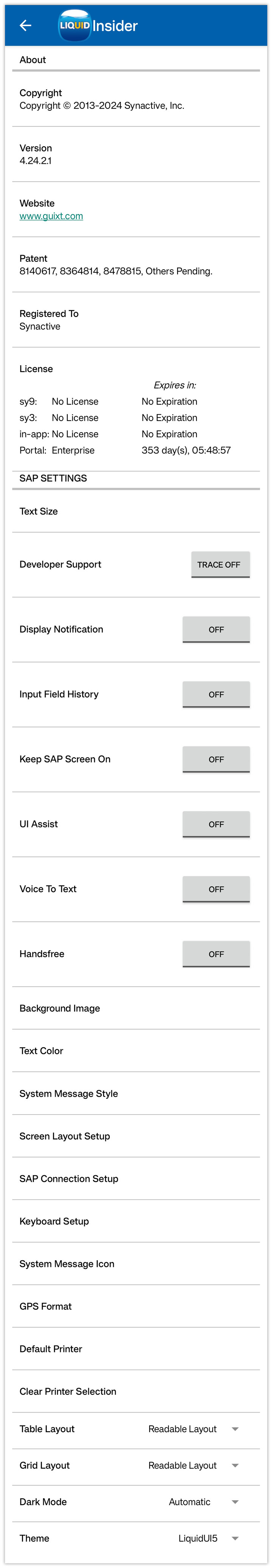 App Settings present in the Main Menu provide access to the Liquid UI Insider, which consists of Copyright, Client Application Version, and License-related information. It also consists of settings for configuring your Android App, such as font size and color adjustments, background image changes, default printer selection, table layout modification, and theme choices.
