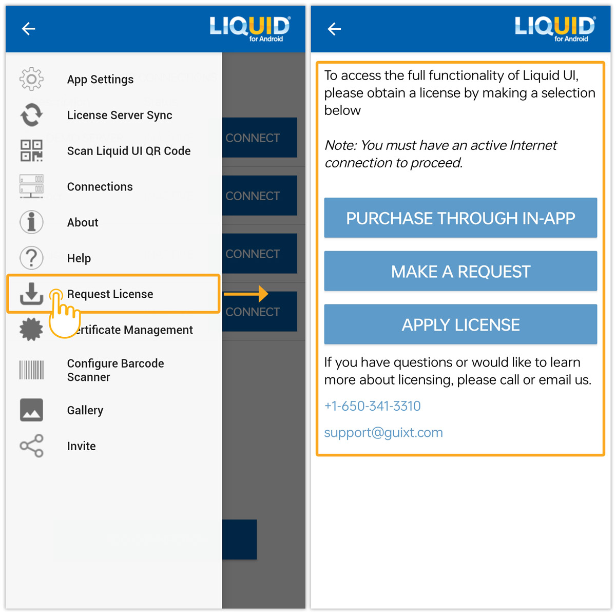 The Request License setting available in the Liquid UI for Android App helps users to request a license. It consists of three options that a user can choose from to proceed with the request: Purchase Through In-App, Make A Request, and Apply License. Click here to learn more about the process of Requesting a License.