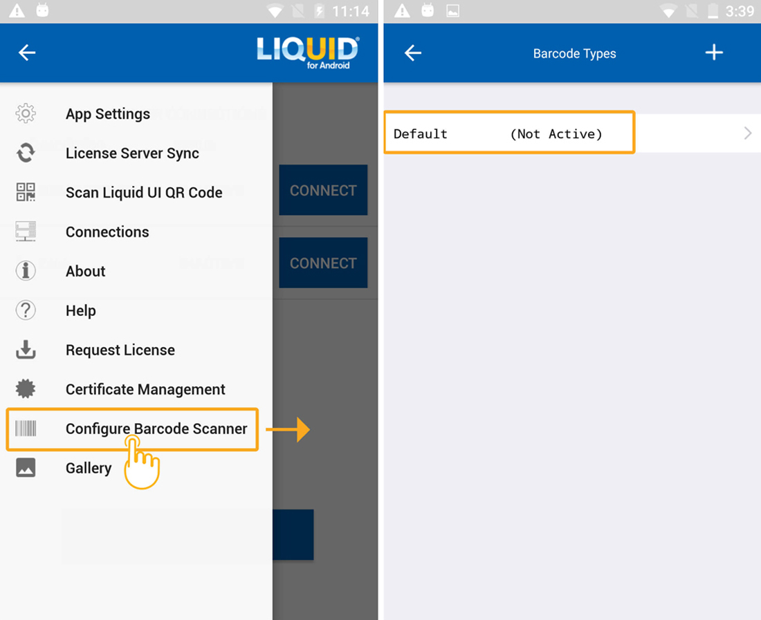 Liquid UI for Android App supports full native scanner configuration. The Configure Barcode Scanner setting present in the App enables the users to edit the Default Barcode type or add a new Barcode type. It also allows you to add prefixes/suffixes under the Barcode types, to remove them from the barcode scanned value based on your requirement.