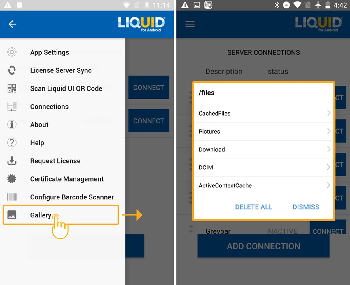 The Gallery option enables you to see all the files uploaded and downloaded to your device through the Liquid UI for Android app, and allows a user to access internal cache files that are stored in different operations. You can view all the files such as images, videos, mp3, PDF, etc., with or without login to a particular SAP server. It includes the following folders, namely: CachedFiles, Download, DCIM, ActiveContextCache, and Pictures.