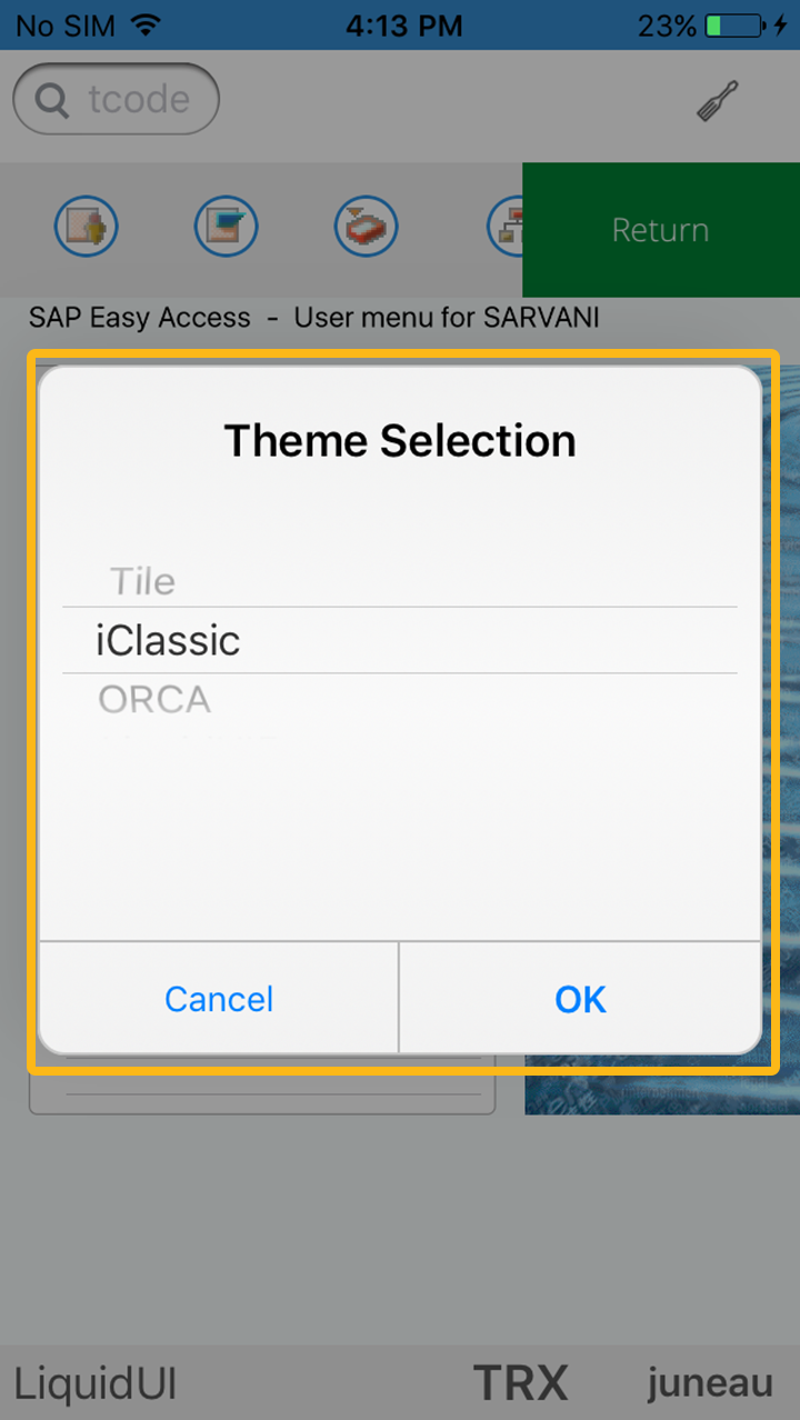 To access themes on Liquid UI for iOS, click on the connection type, which is on the bottom right side of the screen. A context sensitive window will pop-up. Select Theme Selection to apply background theme for your Liquid UI App.