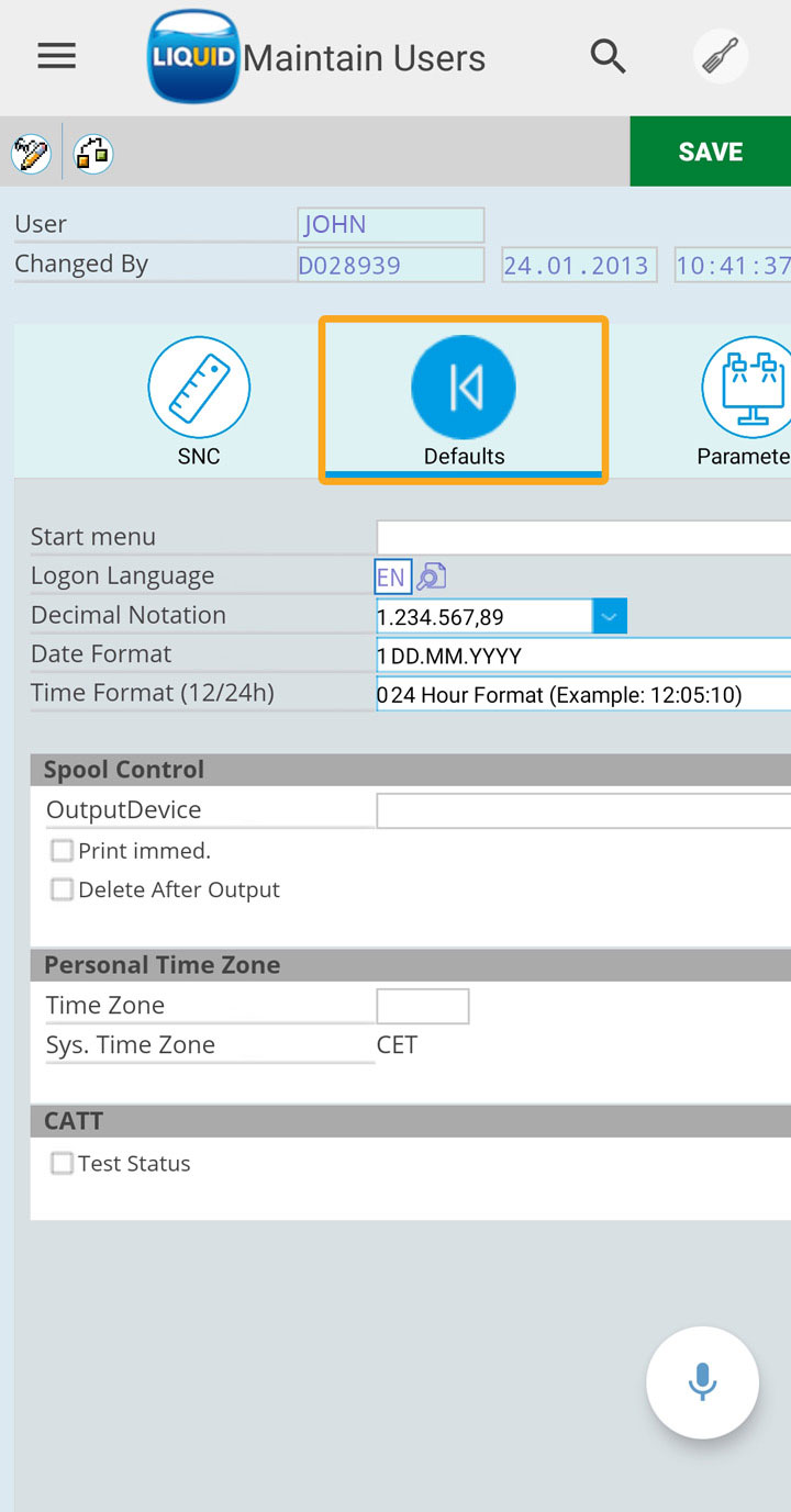 - Click on the Defaults tab and enter the name of the output device which is created in the SPAD transaction. Click on the Save button to save the user data.