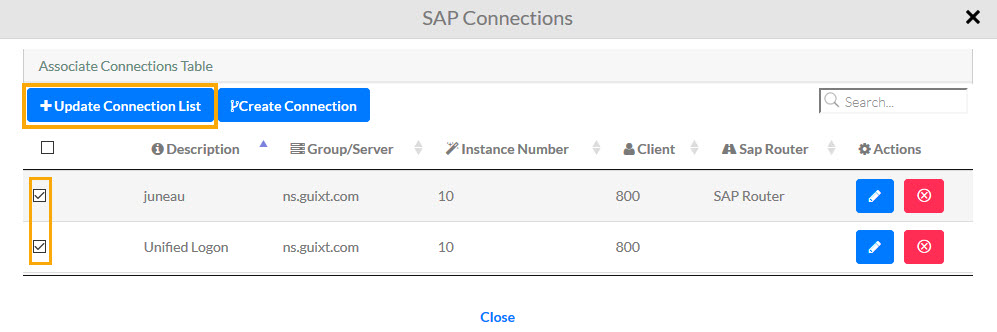 - Make sure to select the checkbox of the desired SAP Connection you want to associate on Liquid UI for iOS App. Then click on Update Connection List.