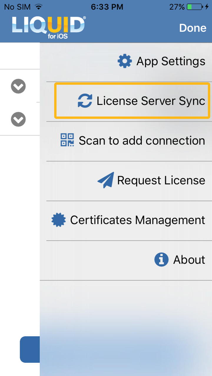 - To view the associated profiles or connections on Liquid UI for iOS App, launch the App and select License Server Sync from the navigation drawer.