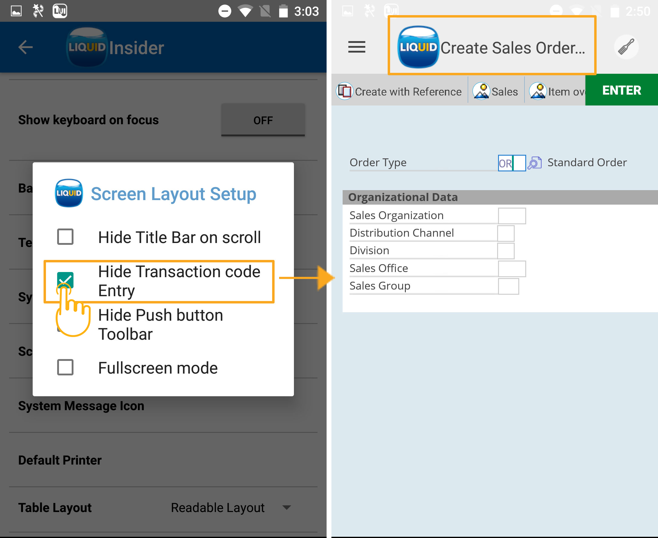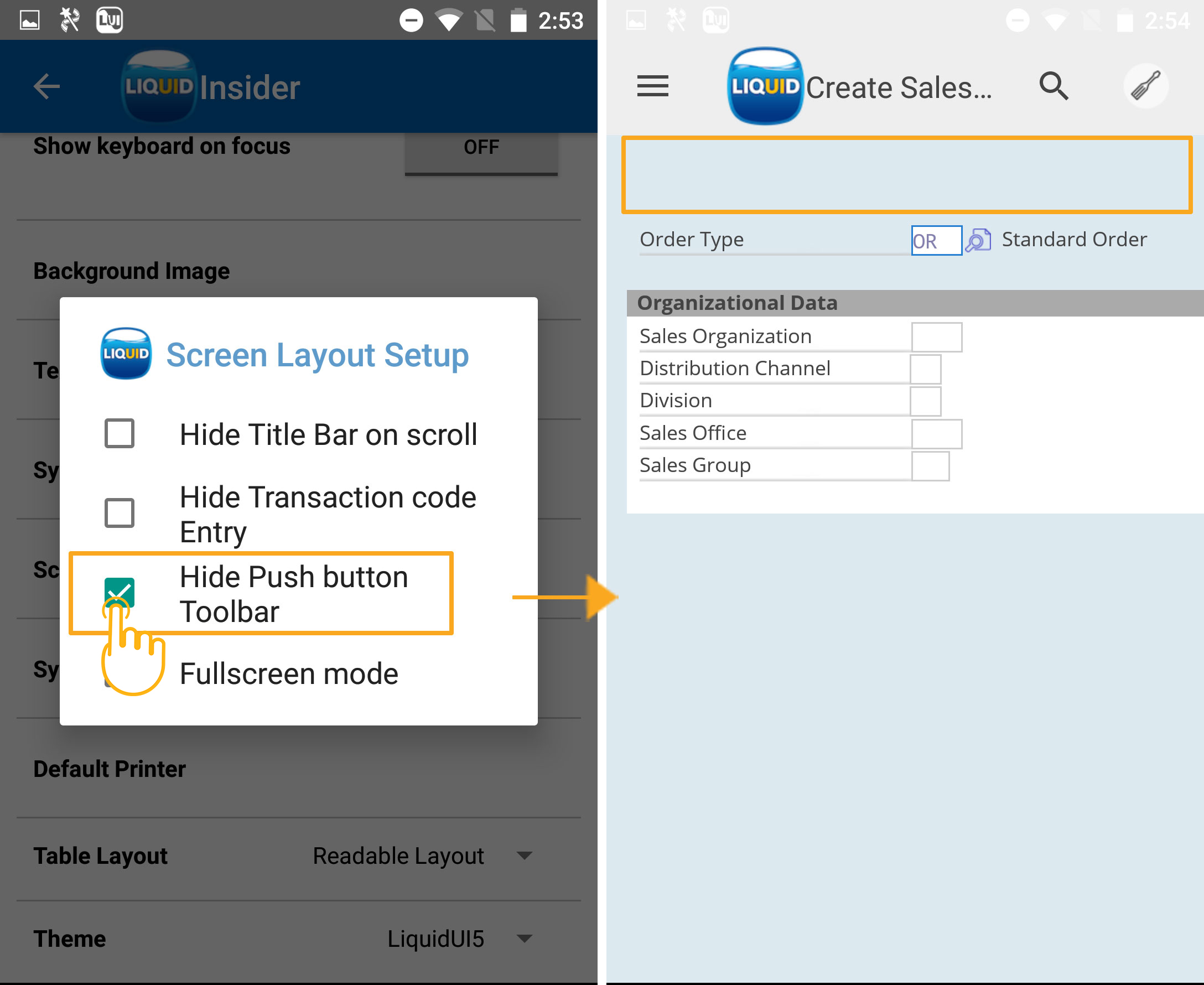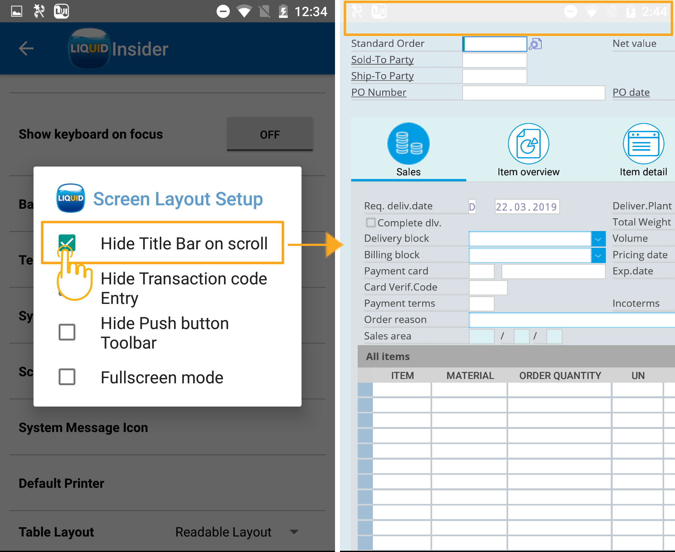 Liquid UI for Android enables you to modify the SAP screen layout for optimal screen usage and better readability without programming. The screen layout setup provides you with four options, Hide Title Bar on Scroll, Hide Transaction Code Entry, Hide Push-button Toolbar, and Fullscreen mode. These options allow you to hide unnecessary elements on the SAP screen as per the requirement. This document illustrates these options and how to enable them.