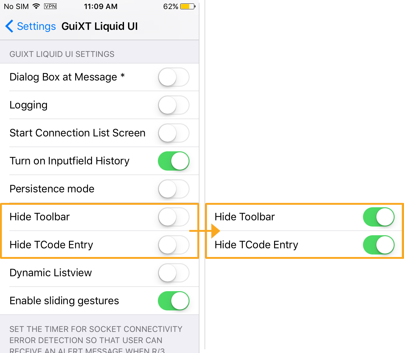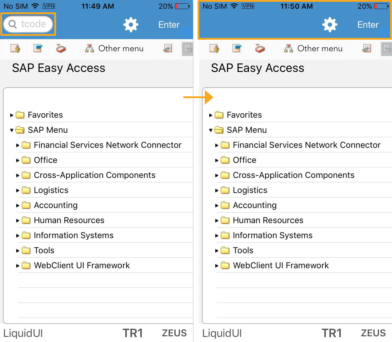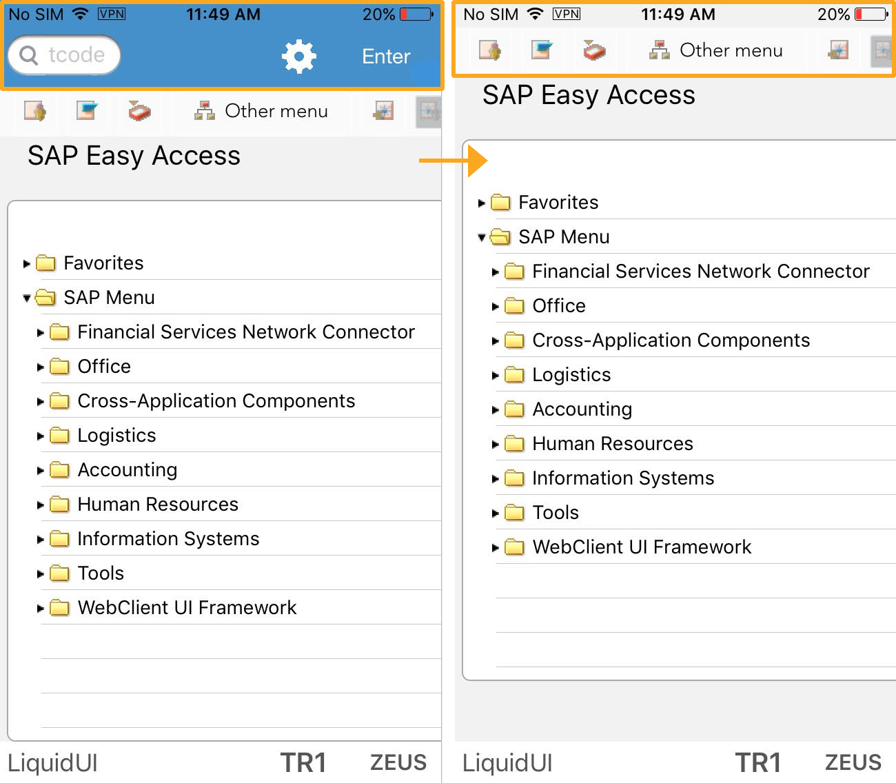 Liquid UI for iOS enables you to modify the SAP screen layout for optimal screen usage and better readability without programming. The screen layout setup provides you two options, Hide Toolbar and Hide TCode Entry. This document illustrates these options and how to enable them.