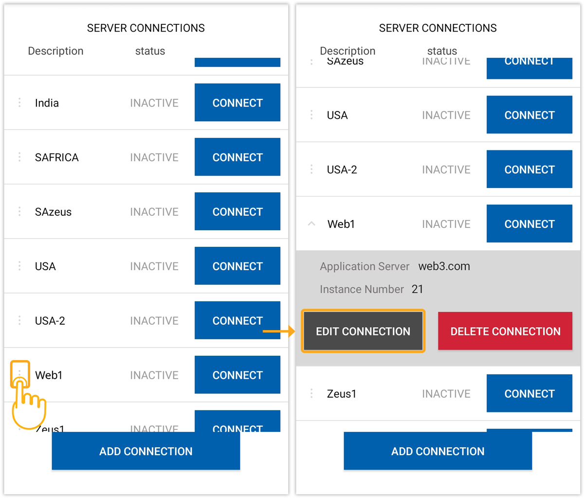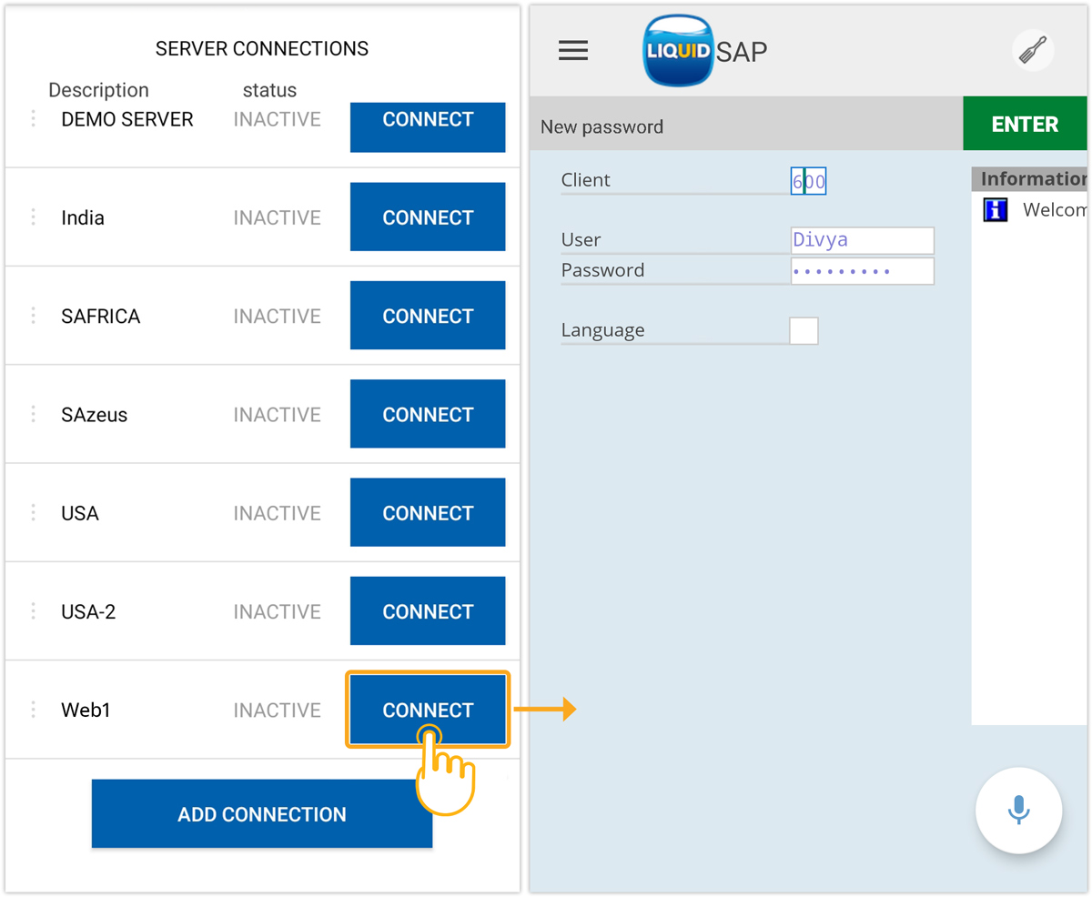 - On your Liquid UI for Android, select CONNECT for the desired SAP server. You will then be directed to the login page, as displayed below.