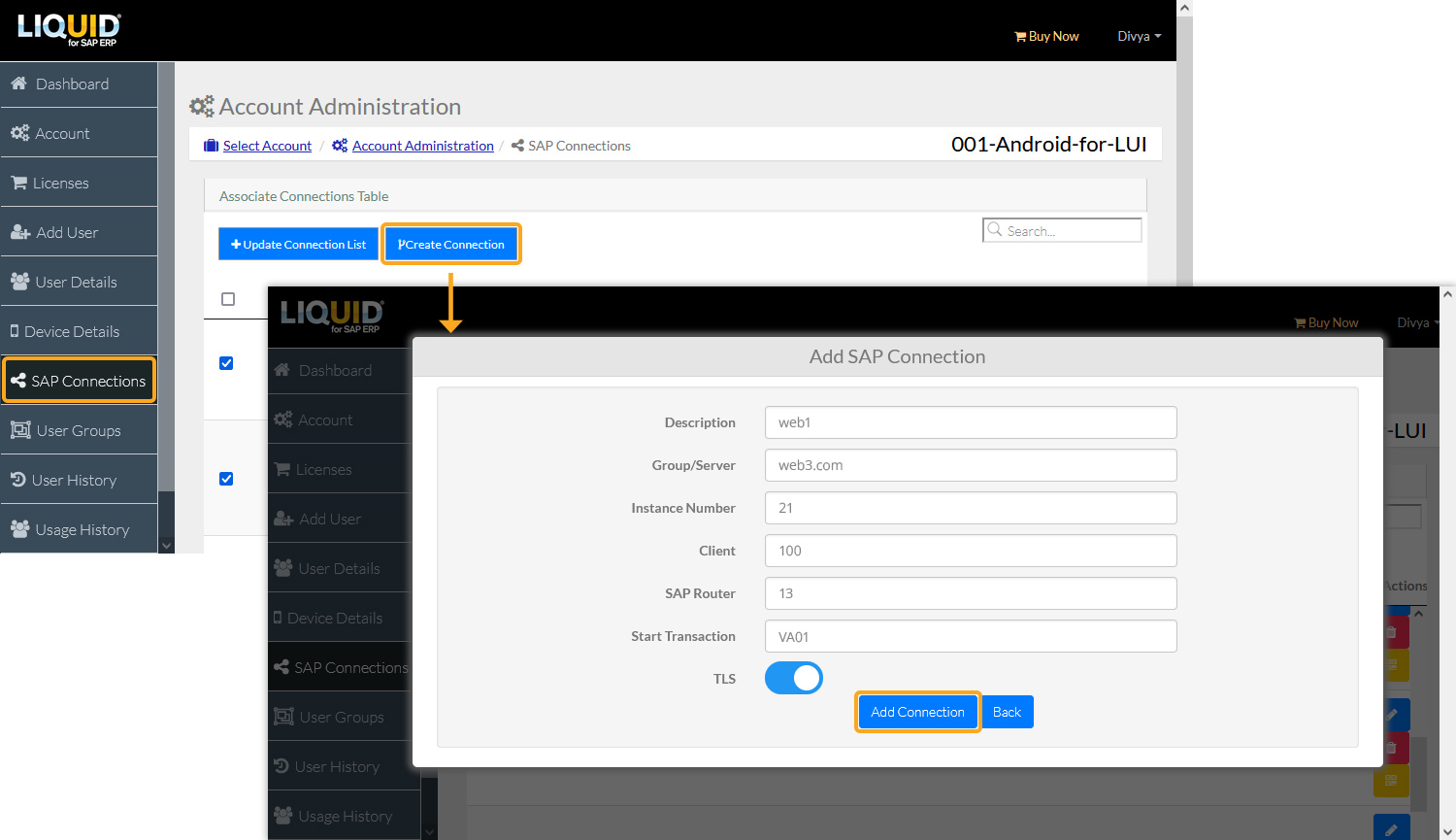 - On the sidebar, navigate to SAP Connections. Select Create Connection and provide the required details, including the Start Transaction (in this case, VA01) and the status of the TLS (enable/disable) option. Finally, click Add Connection.