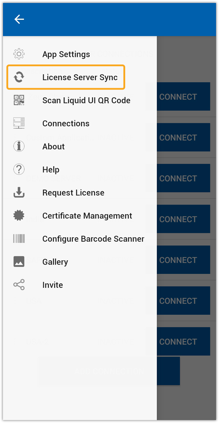 - To sync your Android license, click License Server Sync in Liquid UI for Android, as shown in the image below.