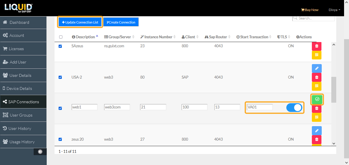 - Once your connection has been created, click the Update Connection List button to add the new SAP connection to the desired account.
