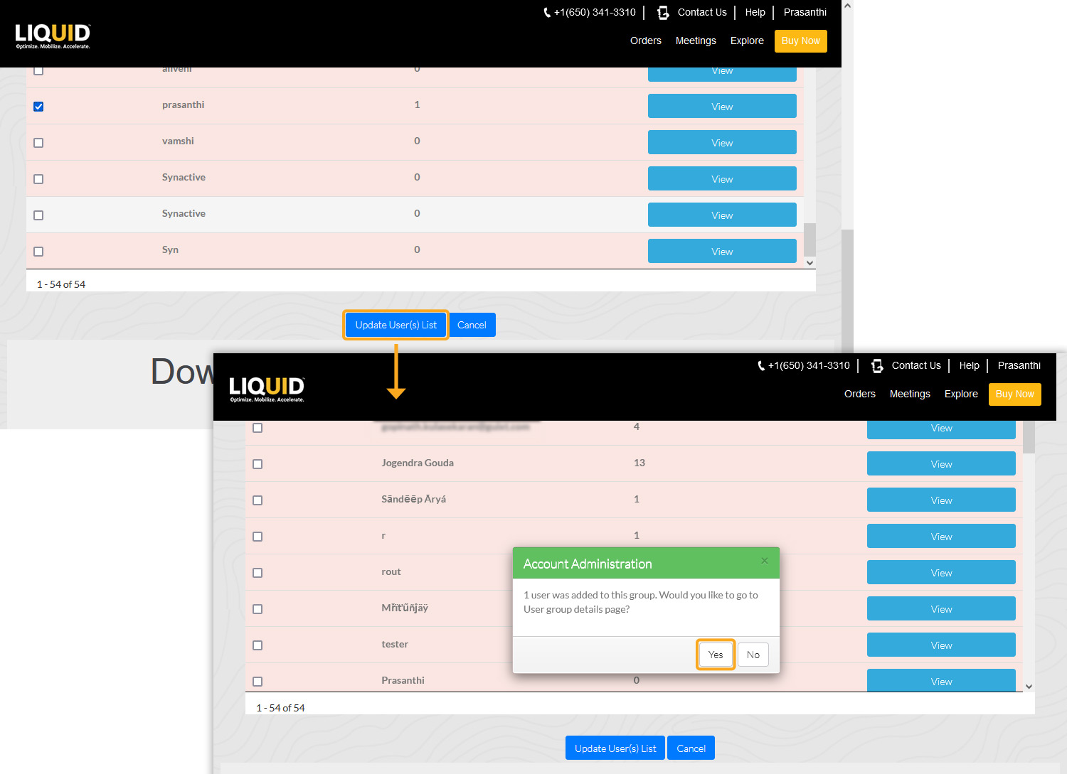 - From the list, select the user you want to link and click the blue Update User(s) List button. A pop-up window will appear to confirm the action. Click Yes to proceed.