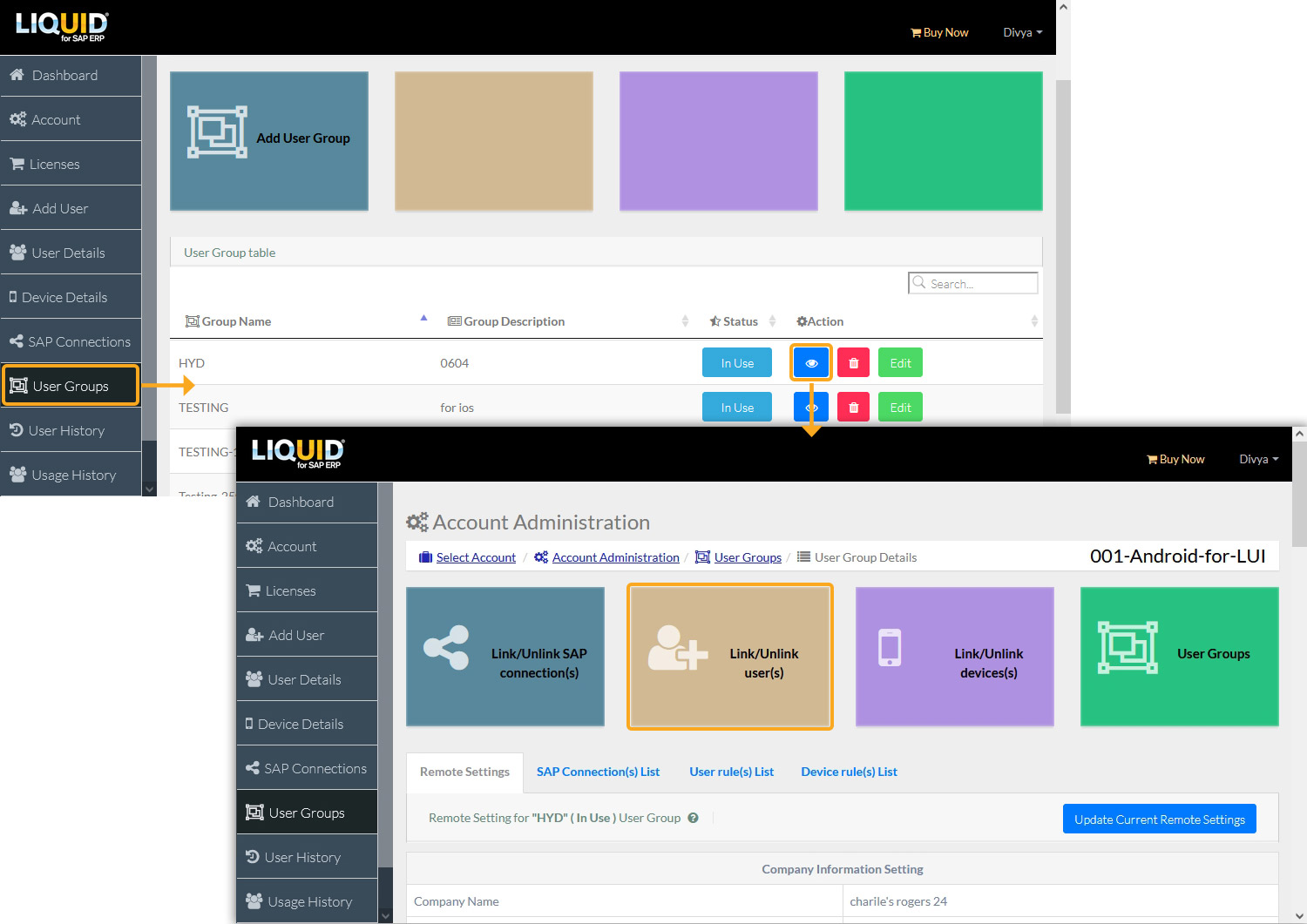 - Log in to LAMP and navigate to your Account Administration page. Under the sidebar, click on the User Groups tab. From the available options, select the desired user group. Locate and click on the Link/Unlink users option, as shown below.