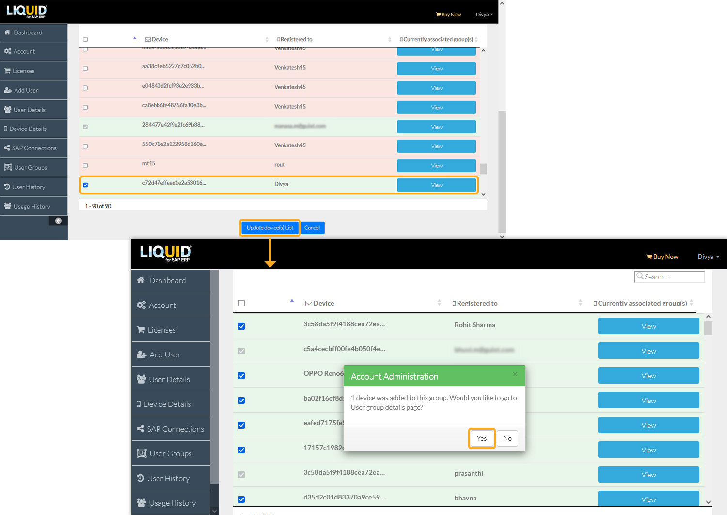 - From the list, select the device you want to link and click the blue Update device(s) List button. A pop-up window will appear to confirm the action. Click Yes to proceed.