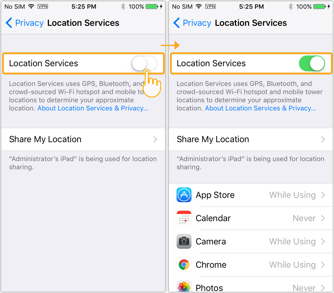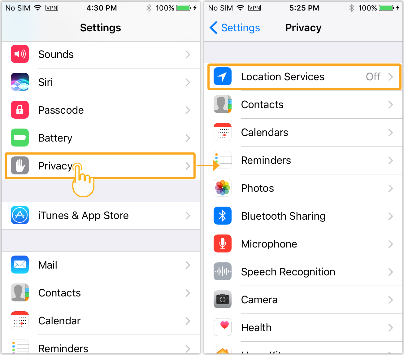 on your iOS device. Then, click the Privacy option and you will see the Location Services option as shown below.