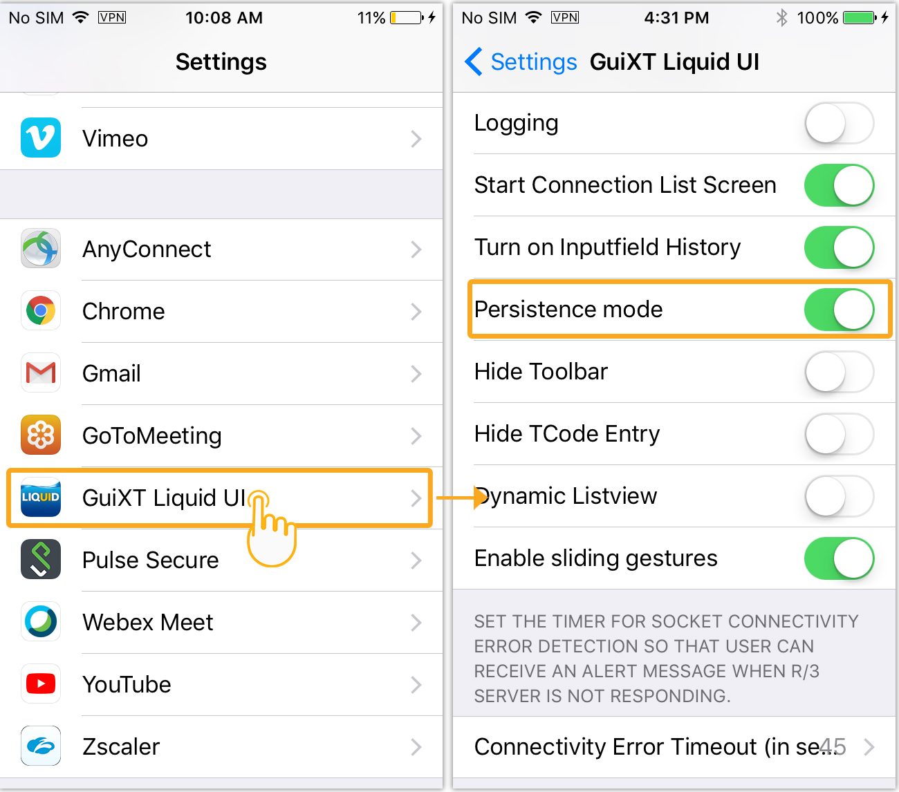 Go back to the Settings screen on your iOS device and click on GuiXT Liquid UI setting and enable Persistence mode to keep your SAP server connection alive.