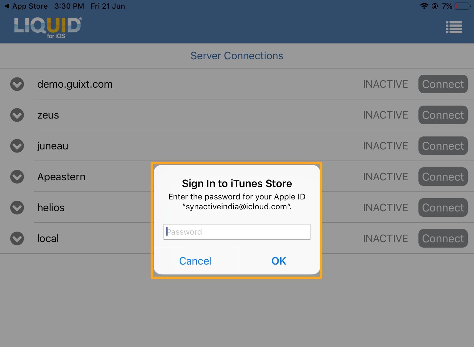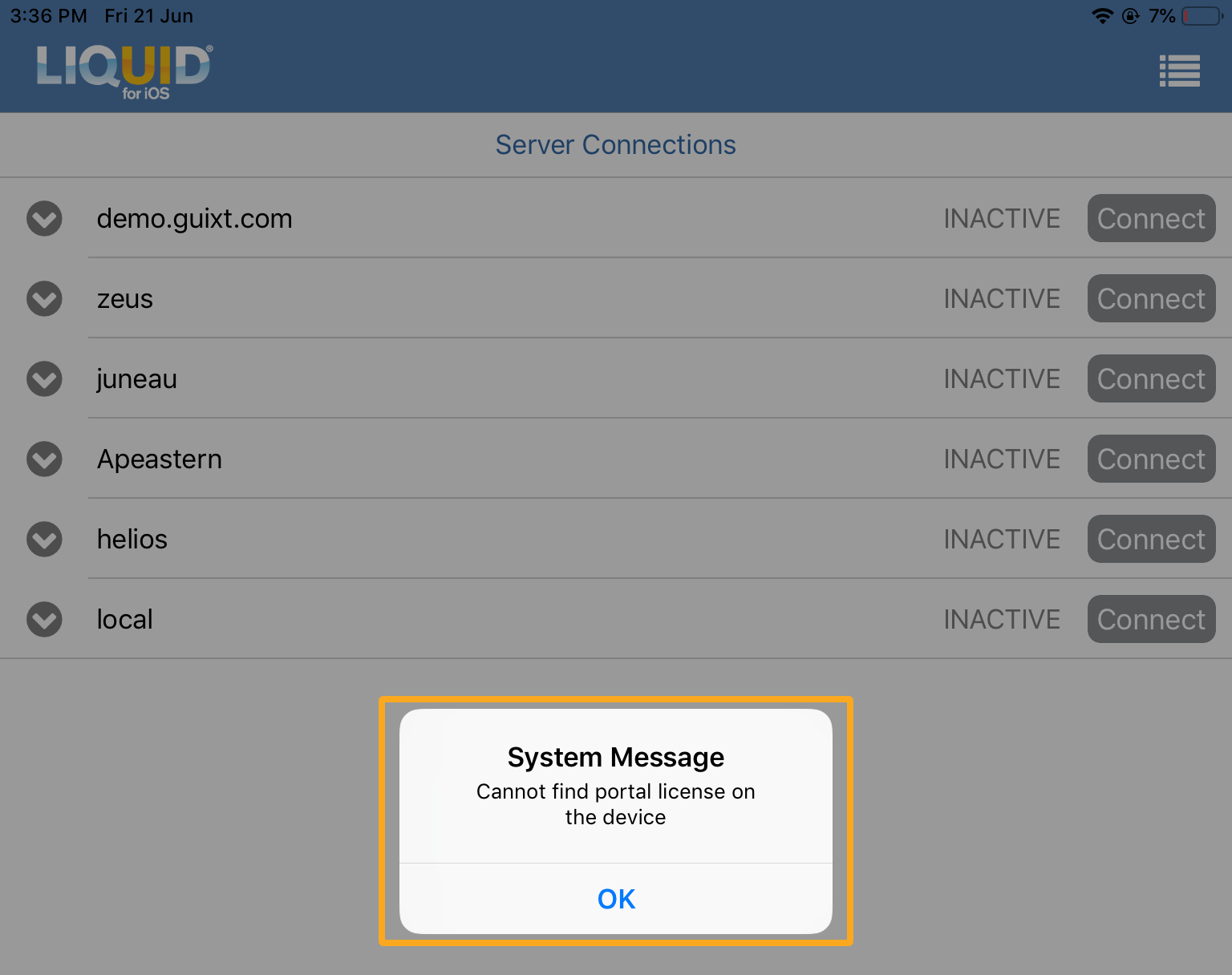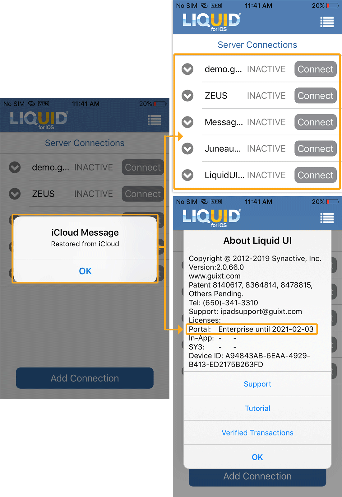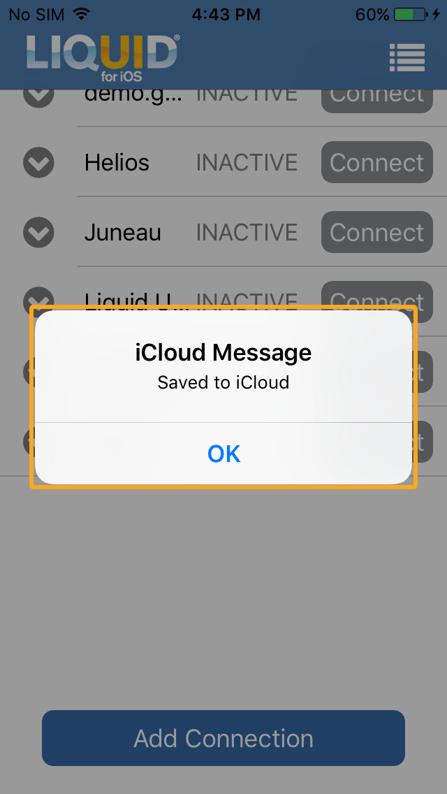 - If you are unable to backup and restore server connections through License Server sync or iCloud options after uninstalling Liquid UI for iOS App or restarting your device, please try the following