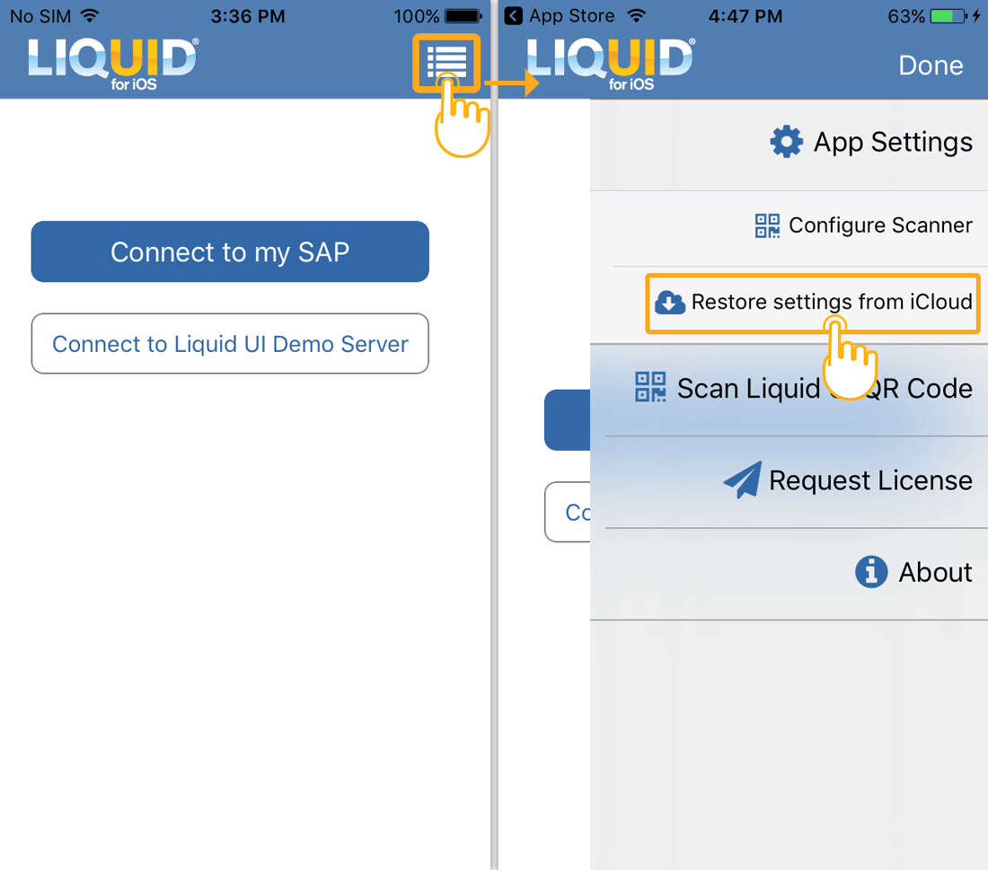 Restoring prevents you from reconfiguring SAP connections and reinstalling licenses when you experience a devastating crash or you accidentally delete the Liquid UI for iOS SAP app from your iOS device.