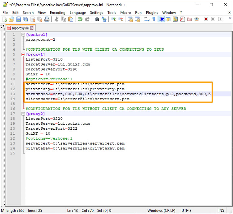 Open the sapproxy.ini file in your Liquid UI Server folder to specify the path of the private key, servercert key, and the generated .p12 file and its password as shown below.
