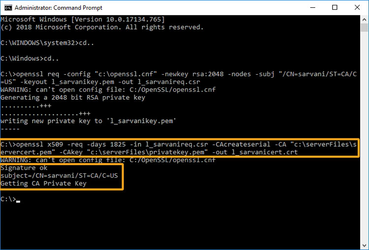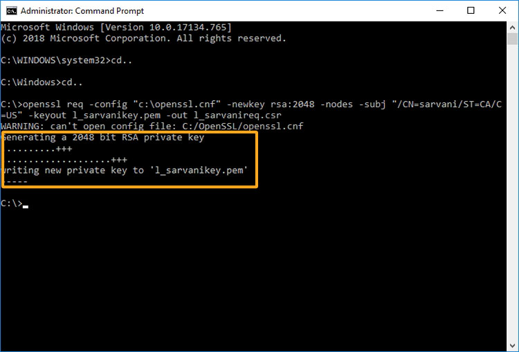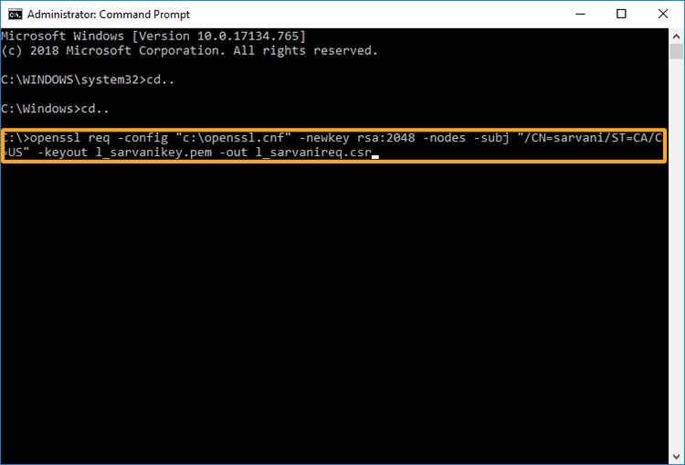 openssl req -config "c:\openssl.cnf" -newkey rsa:2048 -nodes -subj "/CN=sarvani/ST=CA/C=US" -keyout l_sarvanikey.pem -out l_sarvanireq.csr