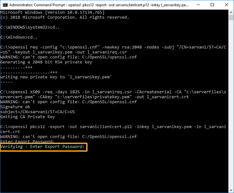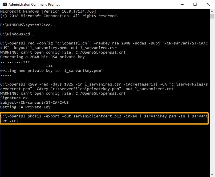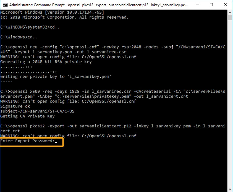 openssl pkcs12 -export -out sarvaniclientcert.p12 -inkey l_sarvanikey.pem -in l_sarvanicert.crt