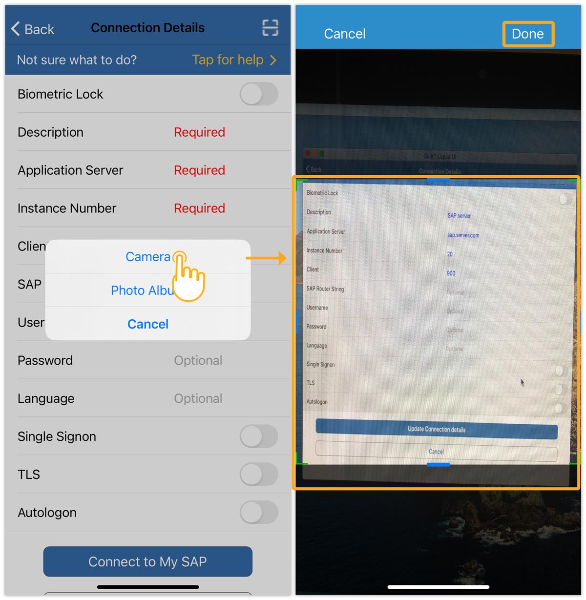 - To capture the connection details from the SAP GUI, select Camera and adjust the region as needed. Tap Done to confirm.