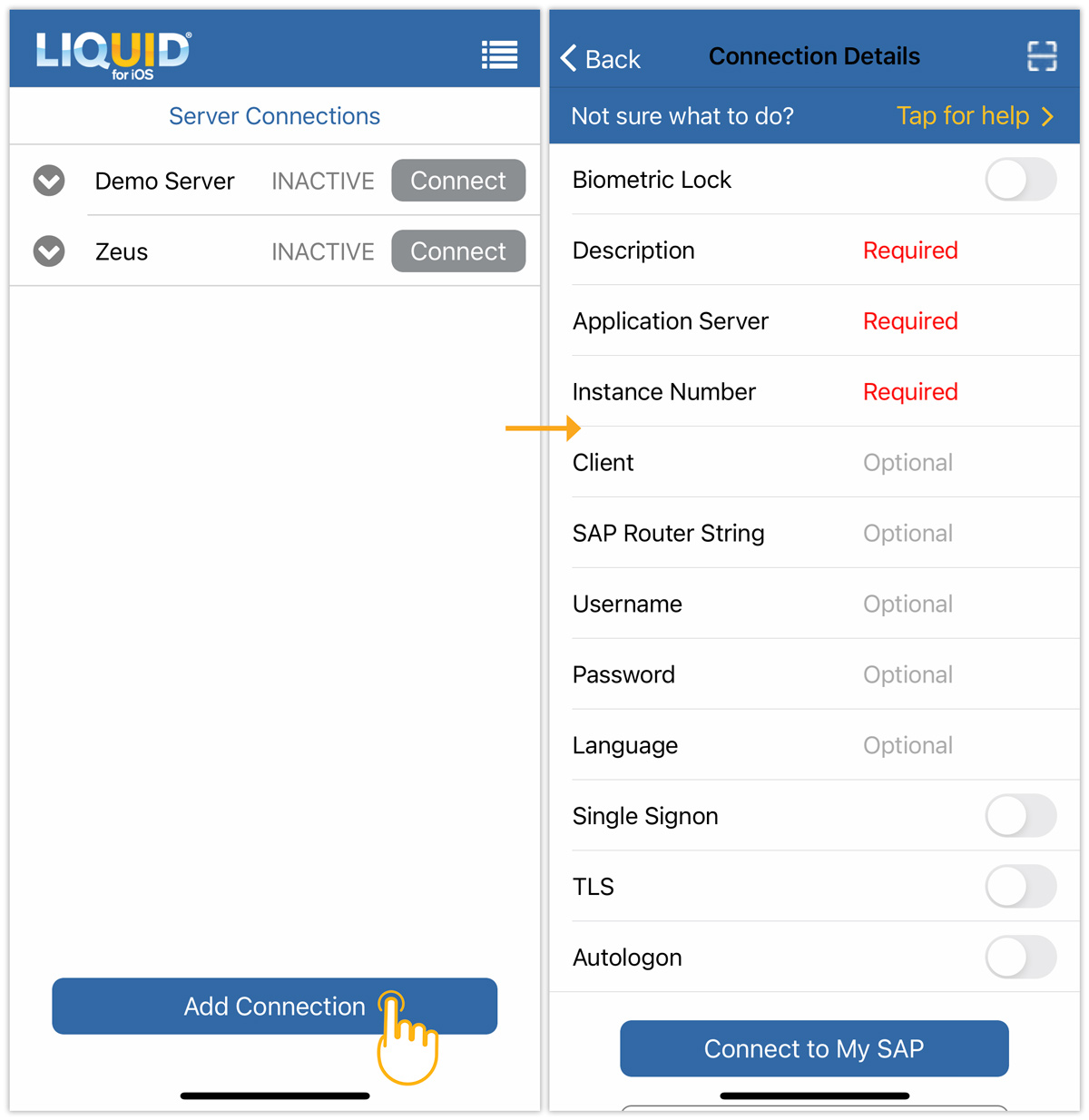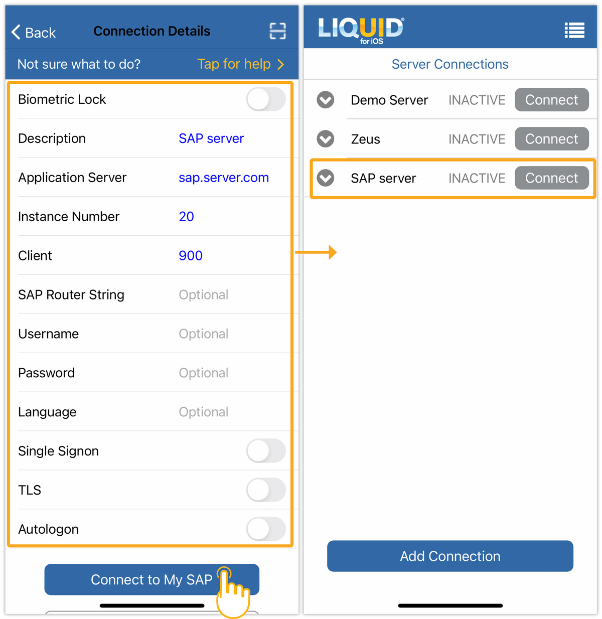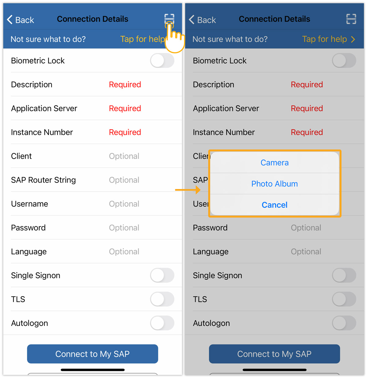 - Once the connection parameters are scanned, tap Connect to My SAP to establish a connection with the new SAP server.