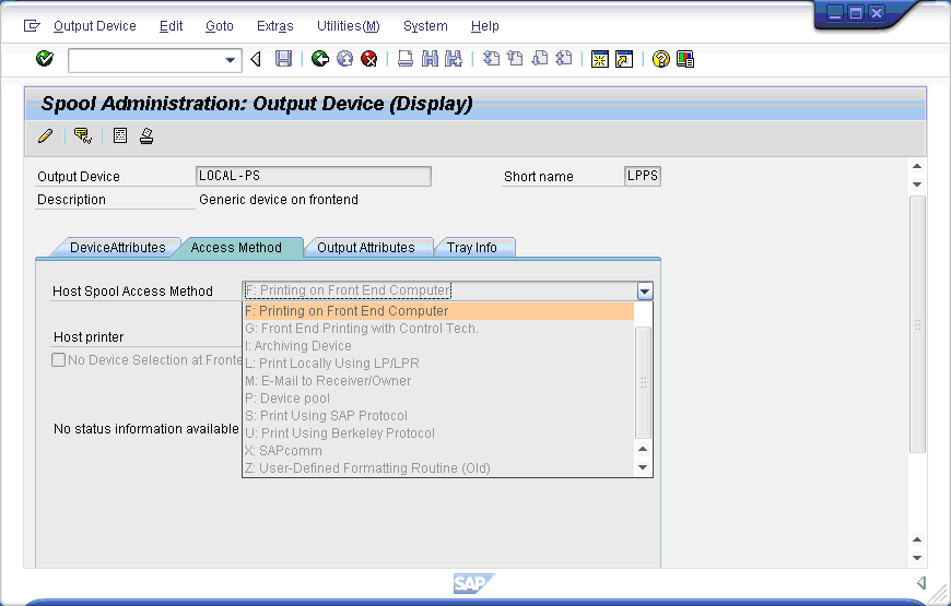 - The following screen will display. Select the Device Attributes tab and click on the Device Type field. The Device Type should be as follows: SAPWIN : Rel.4.x/SAPlpd 4.09+ ONLY!.