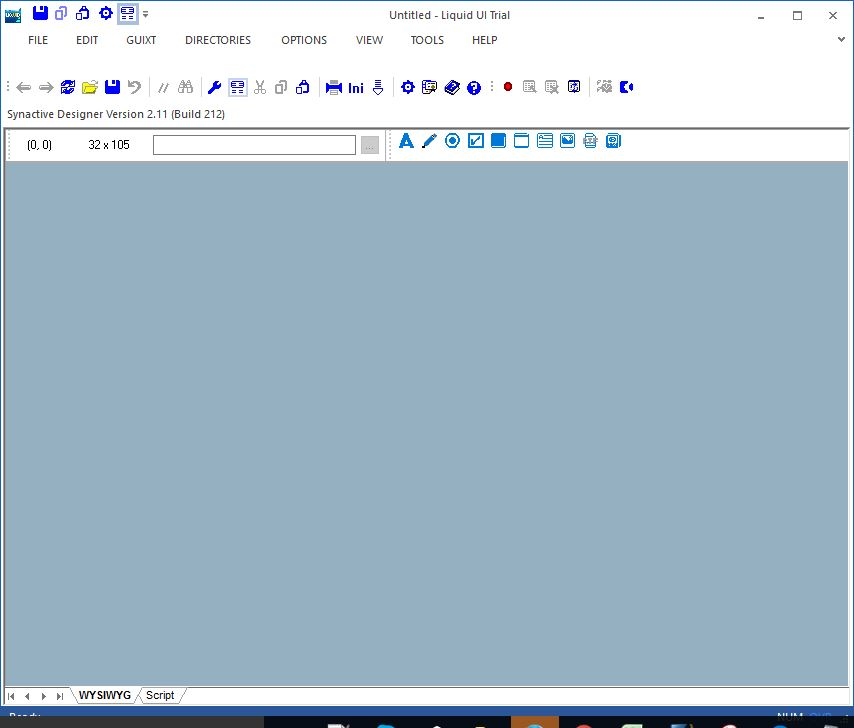 The WYSIWYG editor enables users to manipulate and edit SAP screens without the need of writing any code. This section covers the WYSIWYG editor in Designer and demonstrates the functionality available. The default WYSIWYG editor with a blank SAP screen appears as follows.
