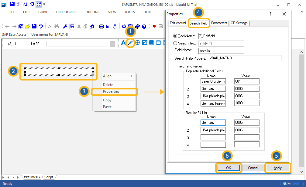 The Fields and values section enables you to specify the values that are available for population in a given field. You can specify up to four field that will be auto-populated when the initial field is populated. You can also restrict the list by entering values to be excluded in the Restrict F4 List section. As in the Populate Additional Fields section, you can specify up to four name-value pairs to be restricted.