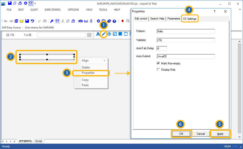 The CE Settings tab is used only if the screens being created are intended for use with the Mobile solution. This tab enables you to specify Smart Attribute patterns for the editfield. Please see the Mobile documentation for a complete explanation of Smart Attributes and how they are used. The CE Settings tab appears as follows: