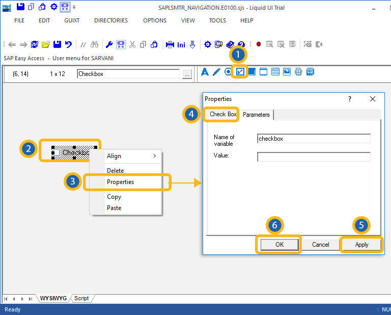 The properties dialog for the checkbox element contains two tabs, as follows: