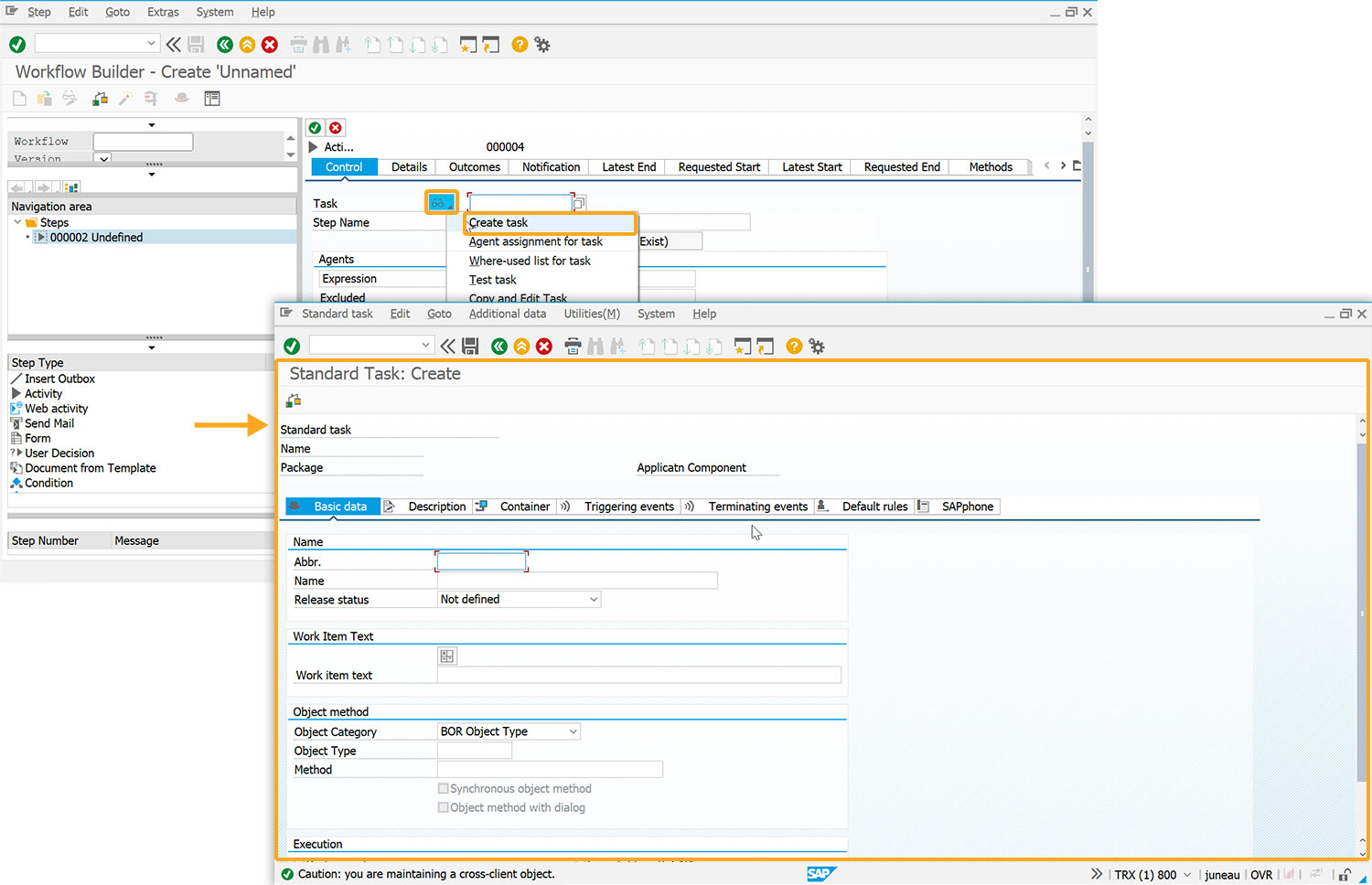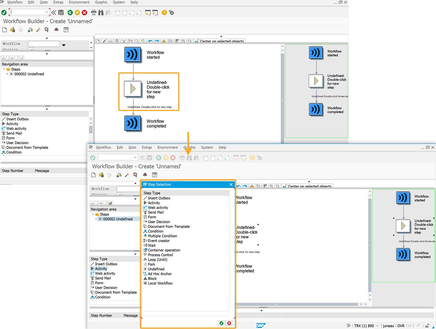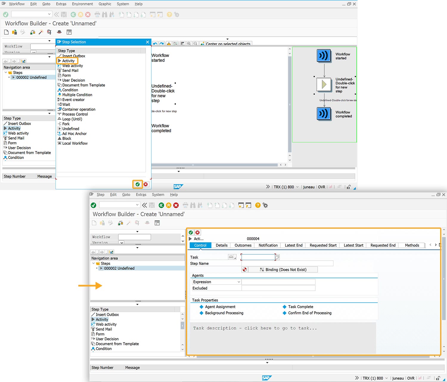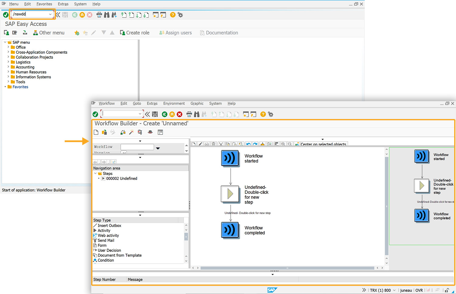- Log on to SAP and navigate to the SWDD transaction. Here, you will find the Workflow Builder - Create ‘Unnamed’ screen.