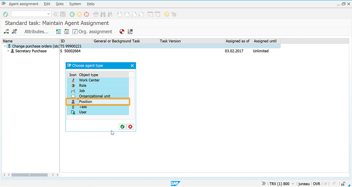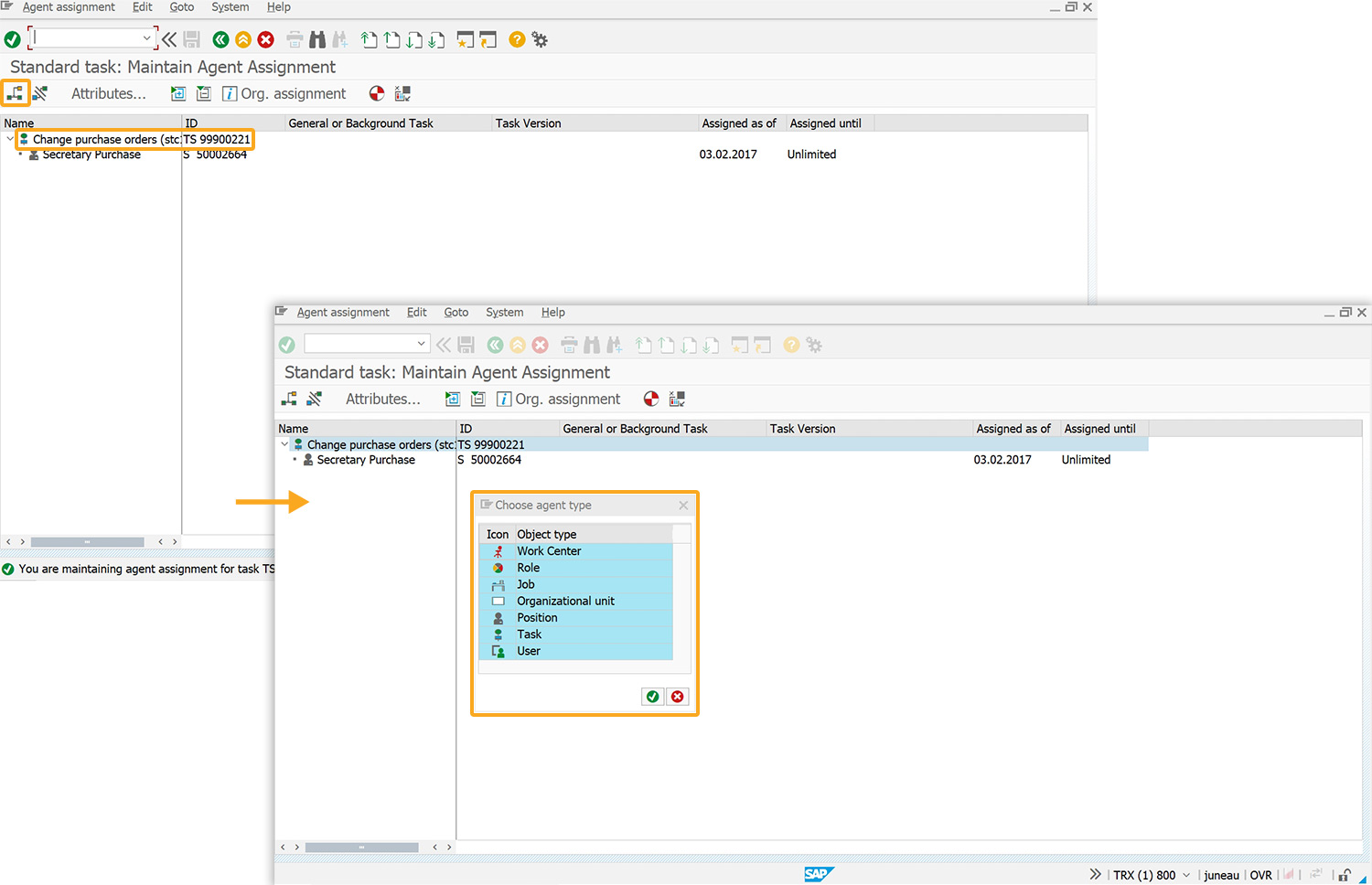 2. Select Change Purchase orders and click the Create agent assignment icon, prompting a popup to choose the agent type.
