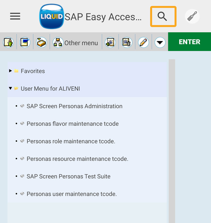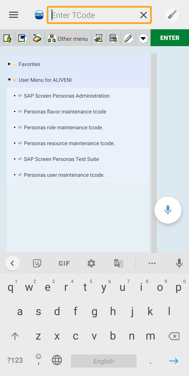 - The SAP transaction field appears at the top of the screen in Liquid UI for Android following successful SAP login.