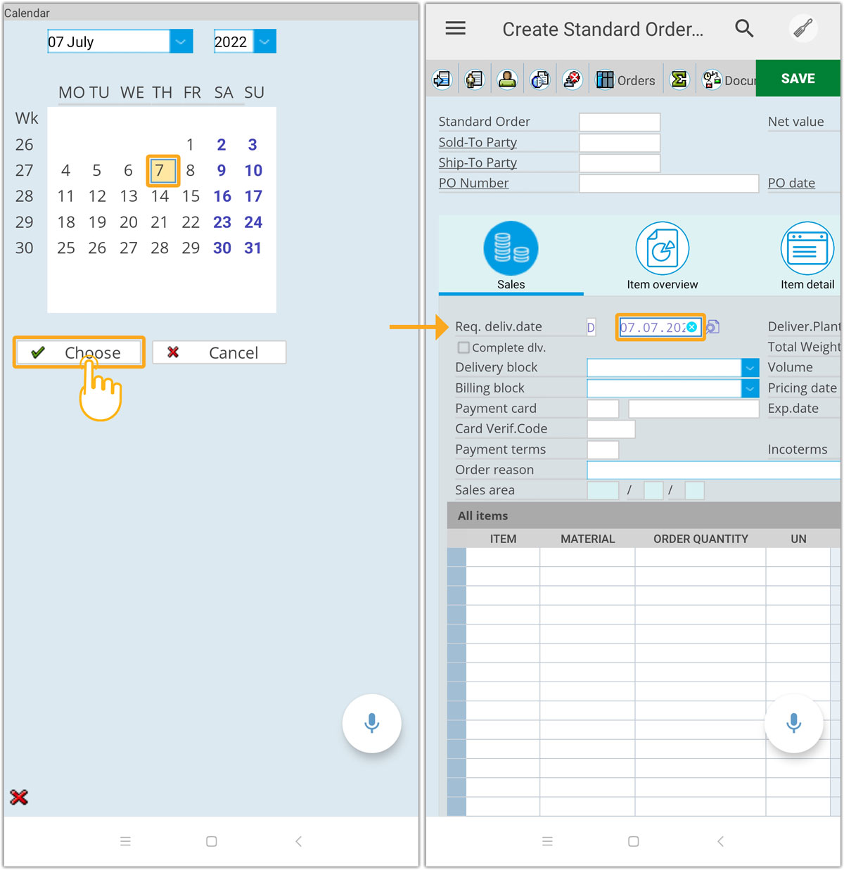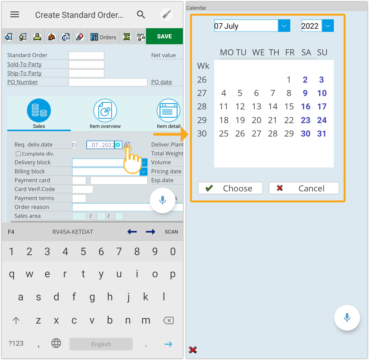 3. Now, select the desired date from the calendar. Clicking Choose option will populate the date details in Reg. deliv.date field, as shown below.