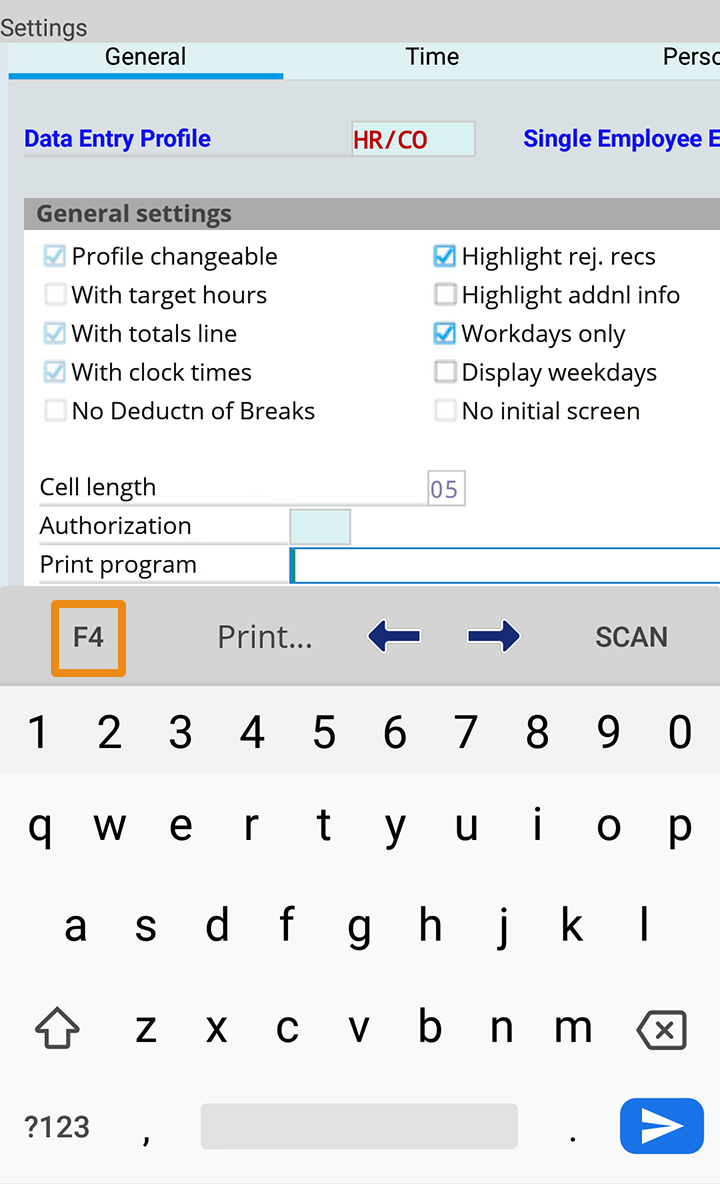 - On the Settings screen, enter the Cell length value and place the cursor on the Print program Input Field. Click the F4 on the device keyboard.