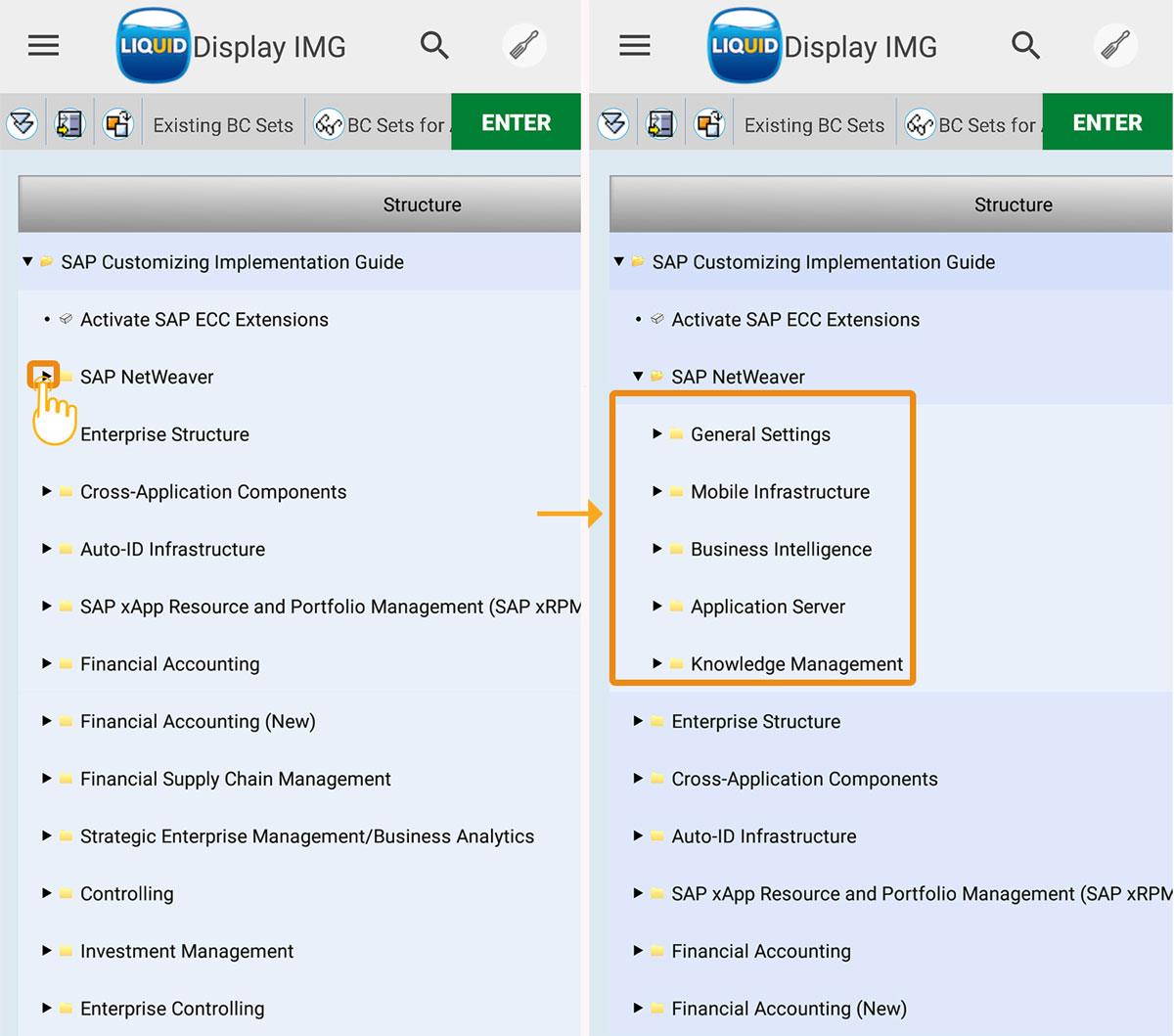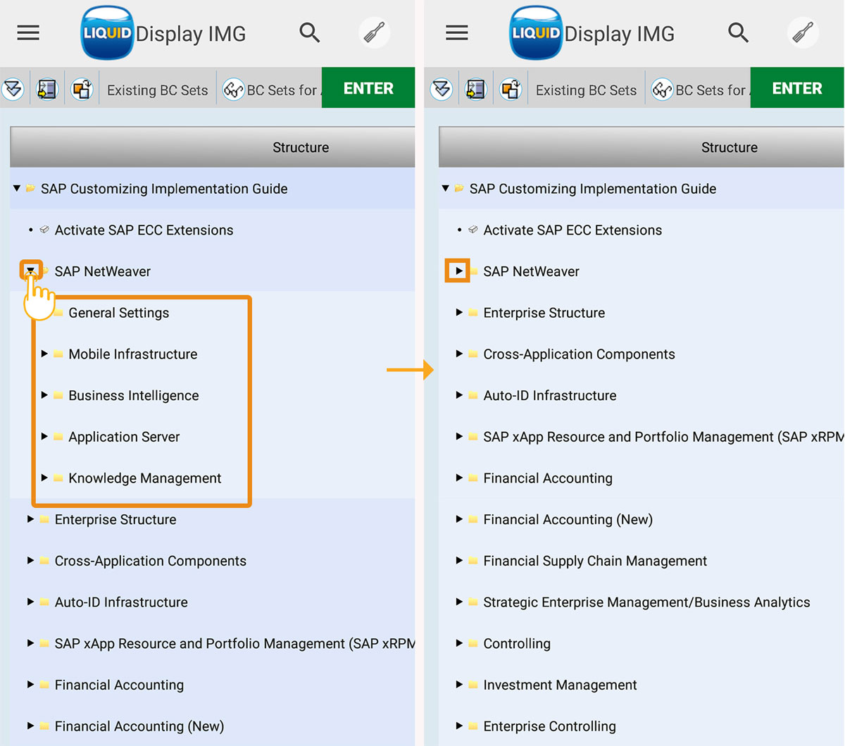 Liquid UI for Android enables you to view a tree in a hierarchical view as you see it in SAP GUI. You can display or hide the child nodes in the tree control. It also supports gestures select and taps.