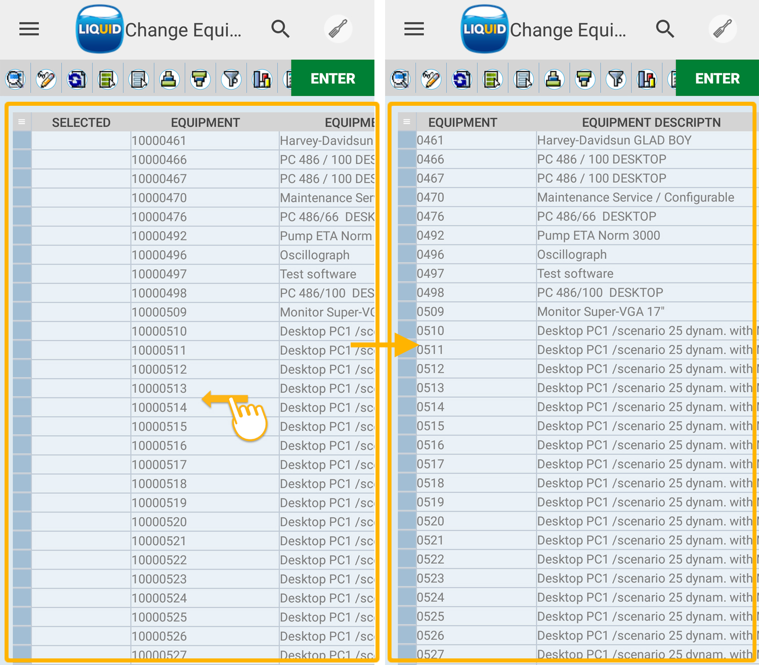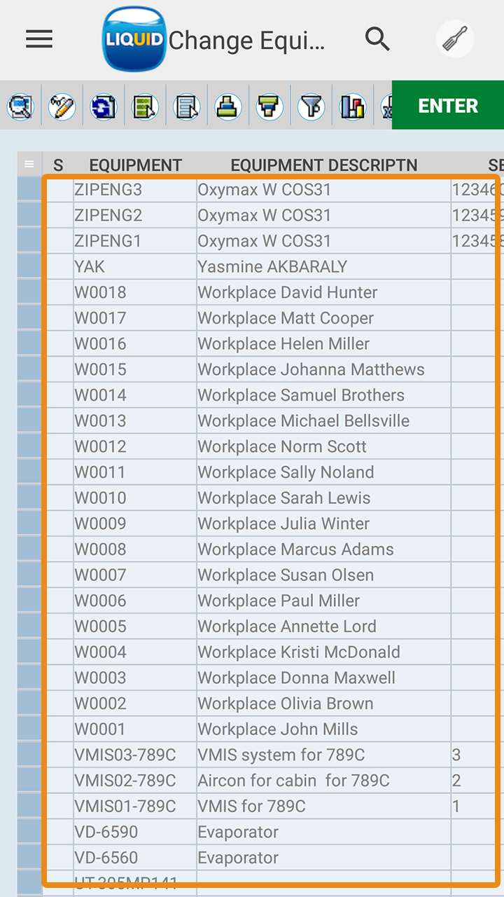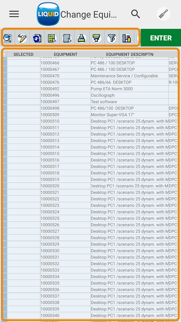 - You will be navigated to the Change Equipment: Equipment screen and able to see a toolbar, a title, and the output table displayed in a grid control.