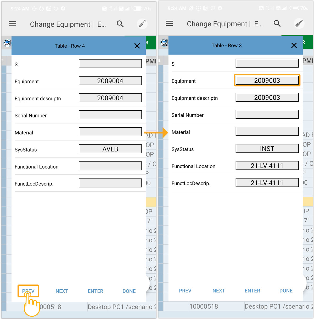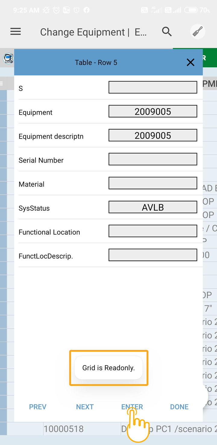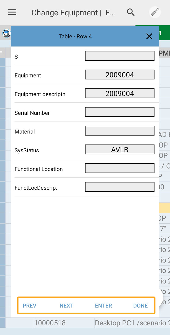 - Long pressing on any grid cell displays a table row pop-up, which allows you to enter values into columns without scrolling. Using Prev, Next, Enter, and Done options you can move within the grid rows. These four options are detailed below.