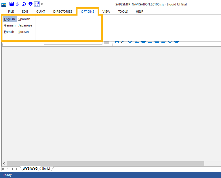 You can set the default language for Designer in the Options menu. The menu appears as follows.