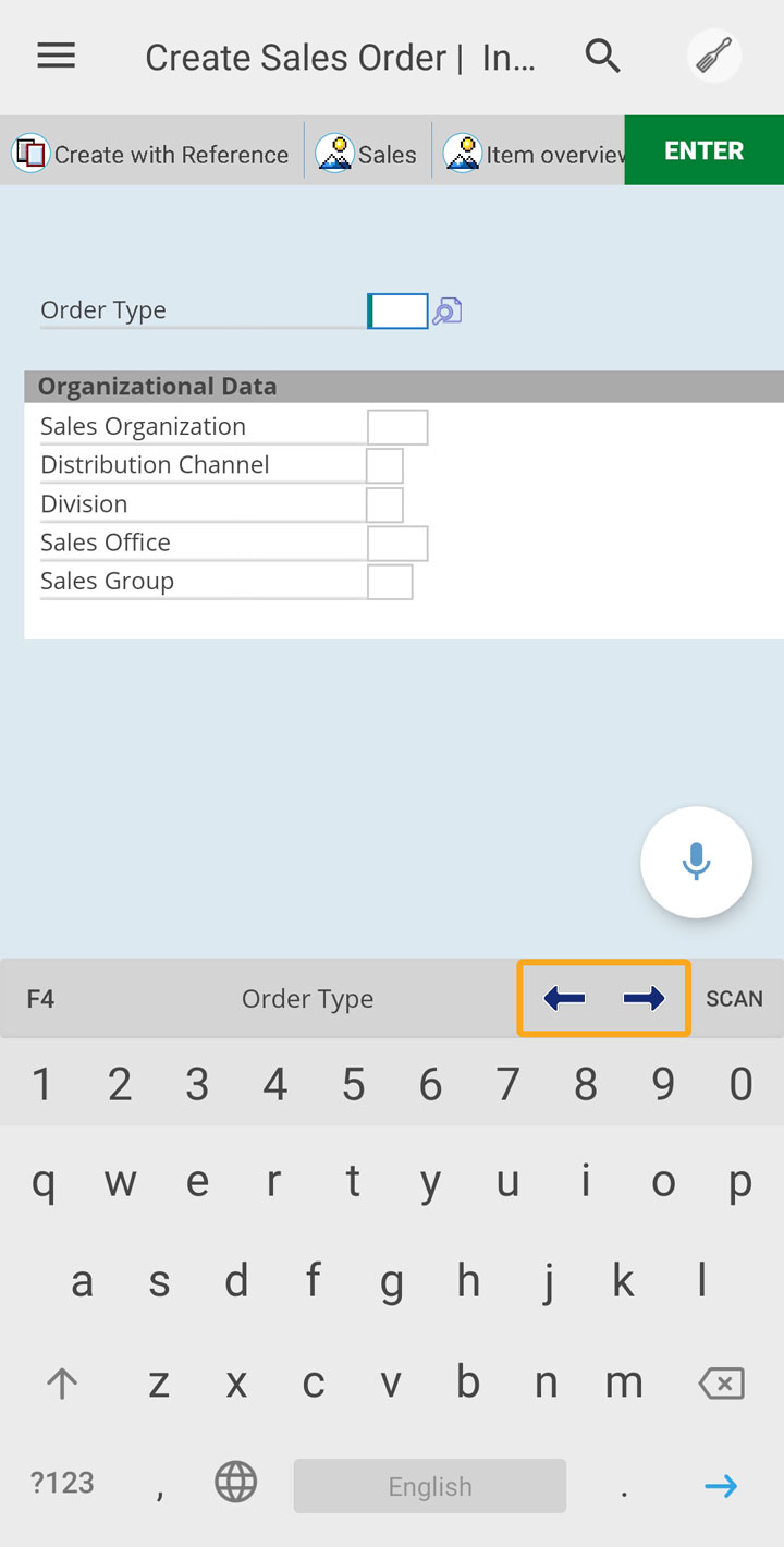 - As you see in SAP GUI, the arrow keys mimic TAB functionality. To demonstrate this, we will navigate to the Create Sales Order: Overview Screen. Placing the cursor on any Input Field will open the device keyboard with arrow keys, as shown in the image. Now, enter 1460 in the Sold-To Party Input Field and click the right arrow key on the keypad to navigate to the next Input Field.