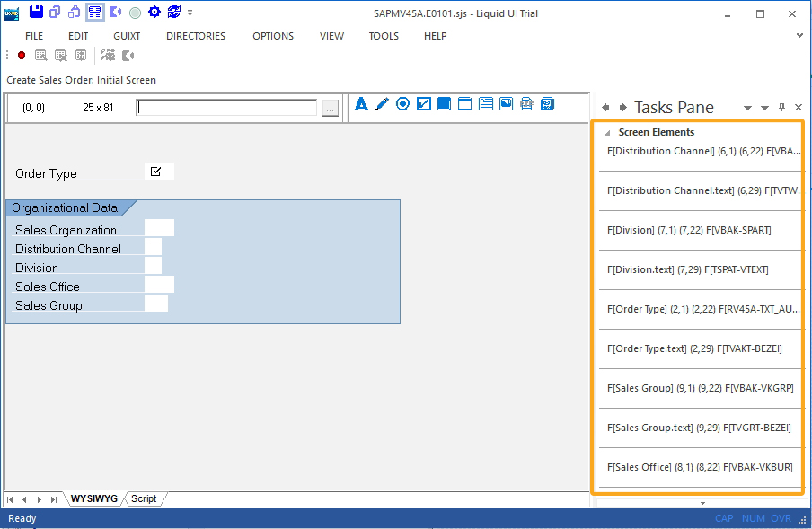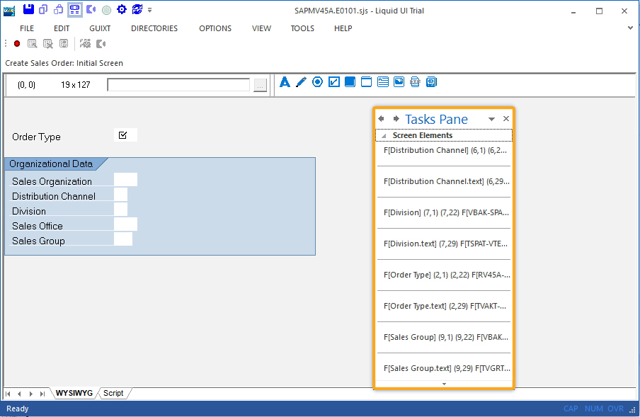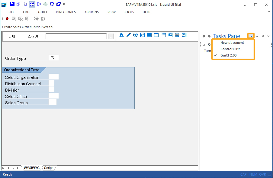 Task PaneTask pane is an interface surface that typically appears on the right side of the window within Liquid UI Designer. Task pane gives users to access the technical details such as position and technical name of the screen controls that help you to create scripts for the customization. You can also view the recently opened script files. You can do the following.