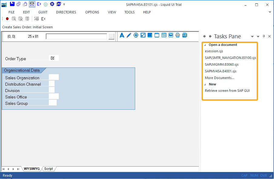 Note: You need to open SAP GUI in order to view all the options and retrieve the SAP screen in Designer. - Select the New Document to open the recently opened document list.