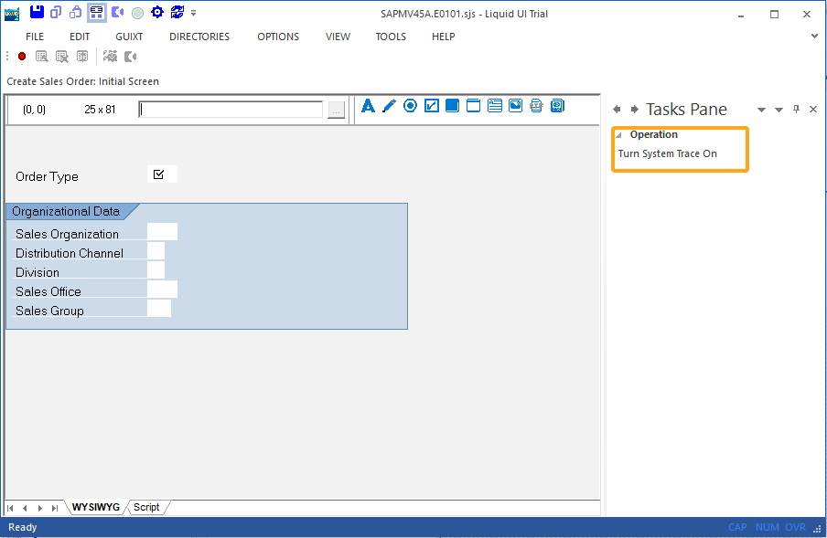 The WYSIWYG option toggles between the WYSIWYG and script editors. WYSIWYG allows for drag-and-drop and graphic editing of the SAP screens, while the script editor is where you can directly hard-code your scripts. The icon appears as follows.