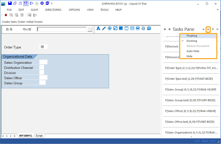 Note: Turn on the system trace and Turn off after performing the operation on SAP GUI or scripts to create a bin file. - Click the second arrow on the Task Pane to see the docking control options as shown below: