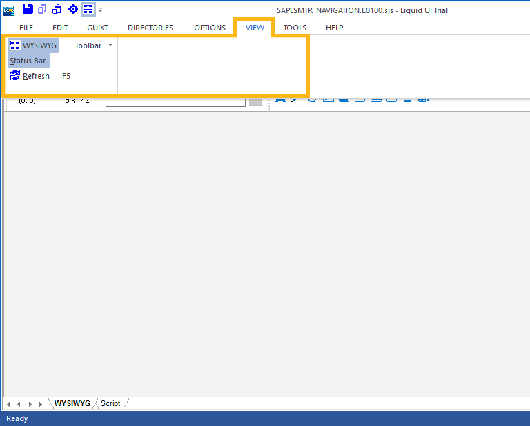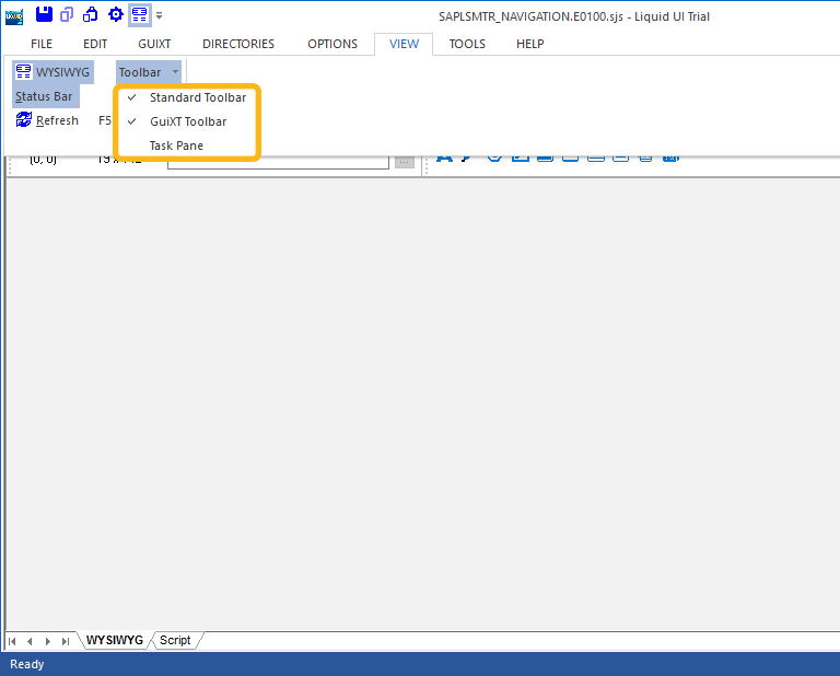 In the View Menu shown below, users can toggle between the WYSIWYG and script editors, turn the toolbars on and off, toggle the status bar on and off, and refresh the Designer with a new SAP screen. You can also refresh the Designer screen and show or hide the Status bar from the View menu. The View menu appears as shown below.