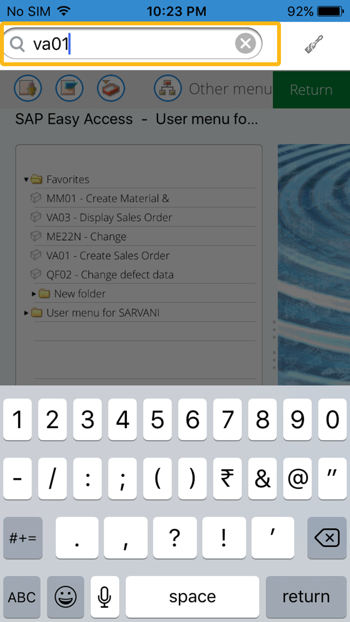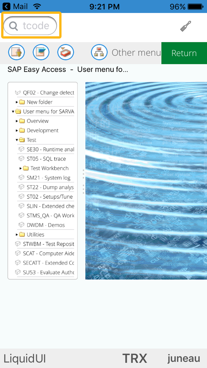 In Liquid UI, the SAP transaction field appears on the top, when you logged in to the Liquid UI on the iPhone as shown below: